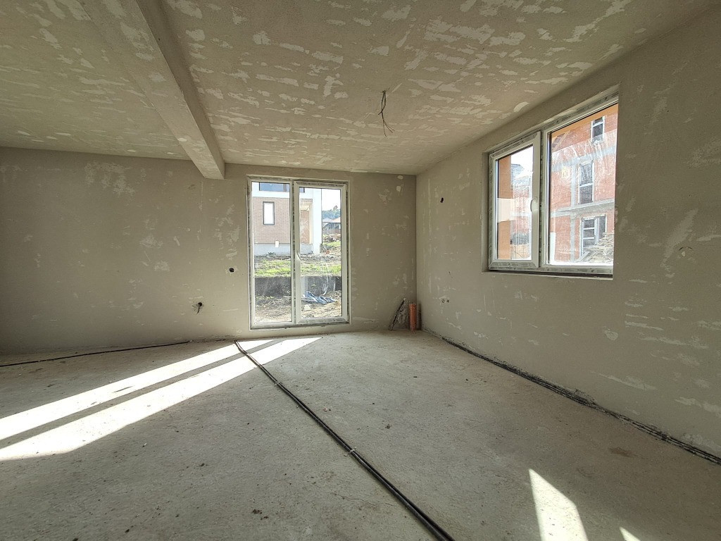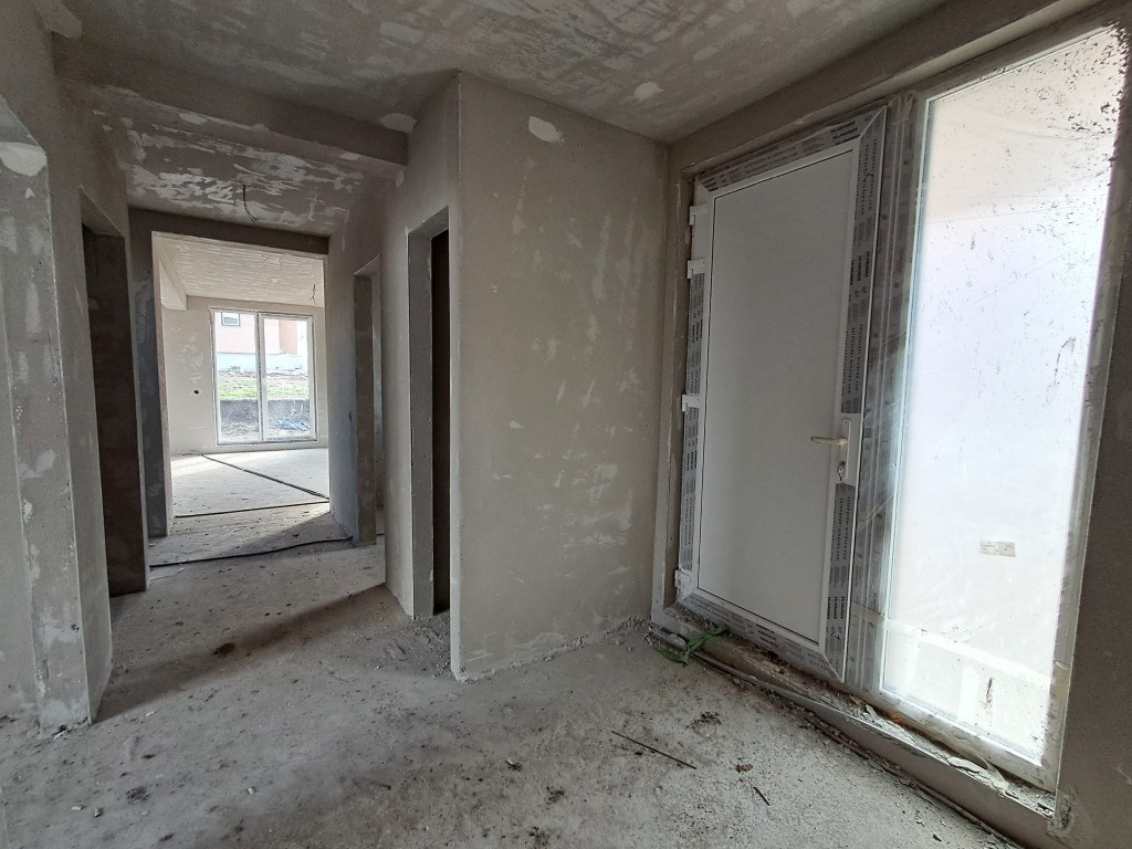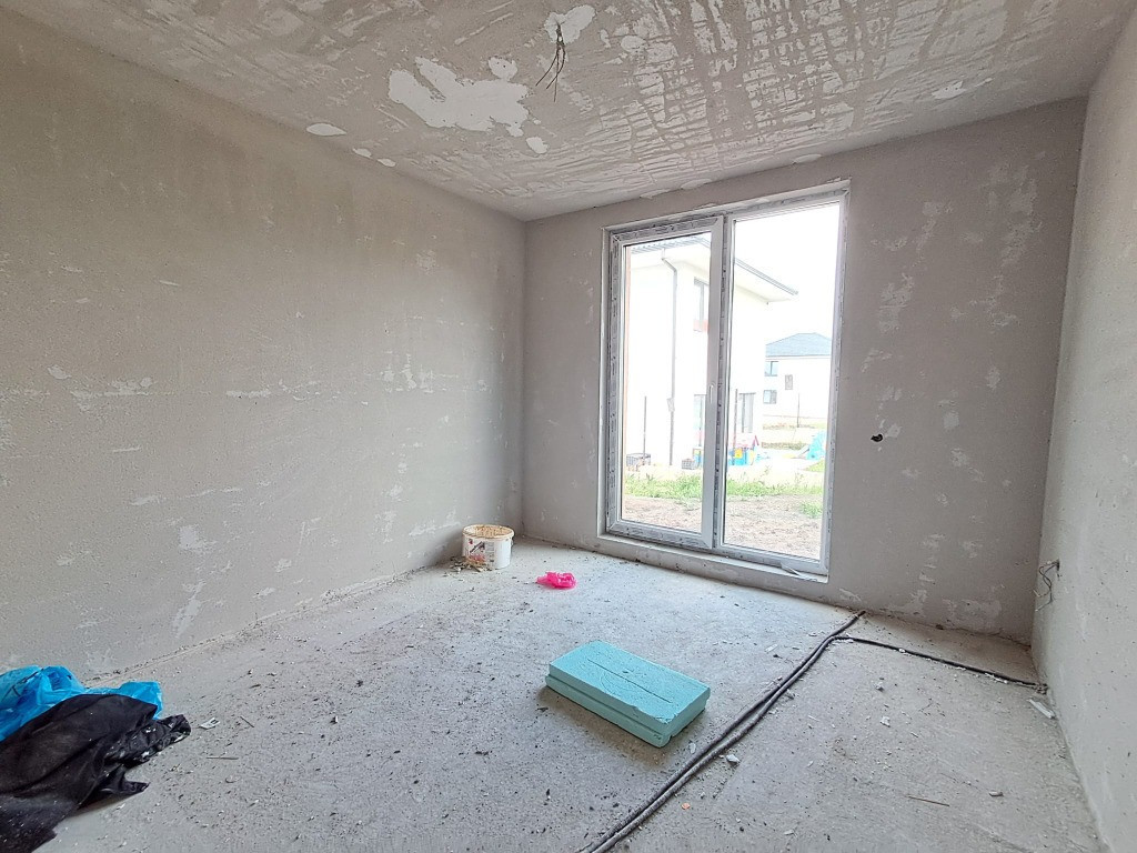 OU Casa cuplata prin garaj sup.124 mp+garaj 23 mp=147 mp la Pretul de 230.000 euro include TVA 21%. Compartimentare la parter astfel: garaj 23 mp, hol 6.45 mp, baie 3.84 mp, birou/dormitor 11.22 mp, living 23.90 mp, bucatarie 8.96 mp si terasa 11.75 mp; iar la etaj sunt 3 dormitoare, 2 bai, 1 hol si 1 balcon 7.03 mp. Dormitor principal cu baie proprie 15.58 mp+5.99 mp. Descriere: Terenul total al ambelor constructii atat casa individuala cat si casele cuplate are o suprafata de 1449 mp. Stadiu finisat la exterior : zidarie caramida 25 cm+termoizolatie polistiren expandat 20 cm, tencuiala decorativa alba, elemente de caramida, tamplarie din pvc cu geam termopan maro, invelitoare tigla ceramica, pergola din lemn pe exterior. Stadiu de semifinisare la interior: tencuit, gletuit, instalatii trase pe pozitii, sape, incalzire prin pardoseala, geamuri termopan. S-au se poate opta si pentru casa individuala astfel: NOU Casa individuala in suprafata de 120 mp la Pretul de 230.000 euro include TVA 21%. Compartimentare la parter astfel: hol 3.76 mp, baie 3.55 mp, birou/dormitor 11.35 mp, depozit 1.4 mp, living 27.62 mp, bucatarie 10.69 mp, terasa acces in casa 2,7 mp si terasa 29.14 mp; iar la etaj sunt 3 dormitoare, 2 bai si 1 hol. Dormitor principal cu dressing si baie 16.64 mp+5.90 mp. Se intermediaza prin agentia Record Imobiliare comision 2%.