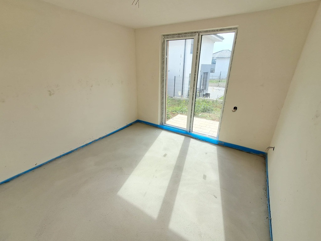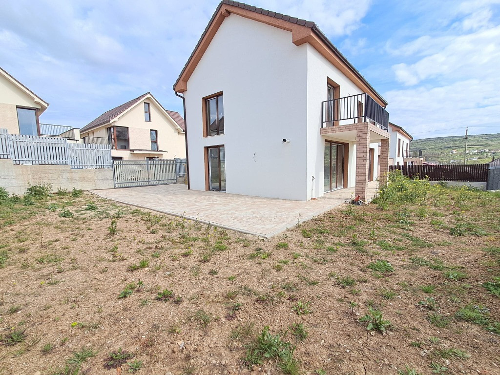 Casa cuplata prin garaj sup.124 mp+garaj 23 mp=147 mp la Pretul de 210.000 euro include TVA 21%. Carte funciara la zi. Compartimentare la parter astfel: garaj 23 mp, hol 6.45 mp, baie 3.84 mp, birou/dormitor 11.22 mp, living 23.90 mp, bucatarie 8.96 mp si terasa 11.75 mp; iar la etaj sunt 3 dormitoare, 2 bai, 1 hol si 1 balcon 7.03 mp. Dormitor principal cu baie proprie 15.58 mp+5.99 mp. Teren 400 mp Stadiu finisat la exterior : zidarie caramida 25 cm+termoizolatie polistiren expandat 20 cm, tencuiala decorativa alba, elemente de caramida, tamplarie din pvc cu geam termopan maro, invelitoare tigla ceramica. Stadiu de semifinisare la interior: tencuit, gletuit, instalatii trase pe pozitii, sape, incalzire prin pardoseala, geamuri termopan. Se intermediaza prin agentia Record Imobiliare comision 2%.