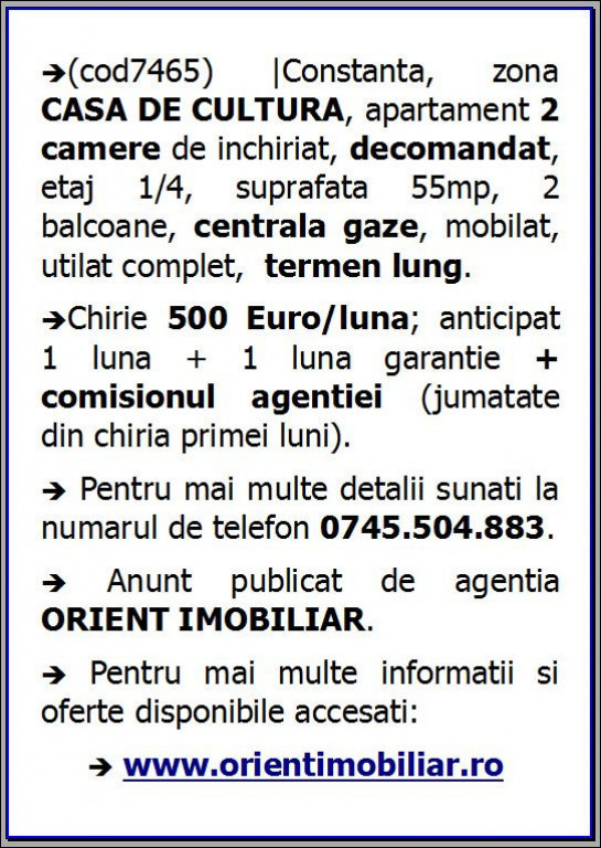 (cod7465) | Constanta, zona CASA DE CULTURA, apartament 2 camere de inchiriat, decomandat, etaj 1/4, suprafata 55mp, 2 balcoane, centrala gaze, mobilat, utilat complet, termen lung. Chirie 500 Euro/luna; anticipat 1 luna + 1 luna garantie + comisionul agentiei (jumatate din chiria primei luni). Pentru mai multe detalii sunati la numarul de telefon 0745.504.883. Anunt publicat de agentia ORIENT IMOBILIAR.