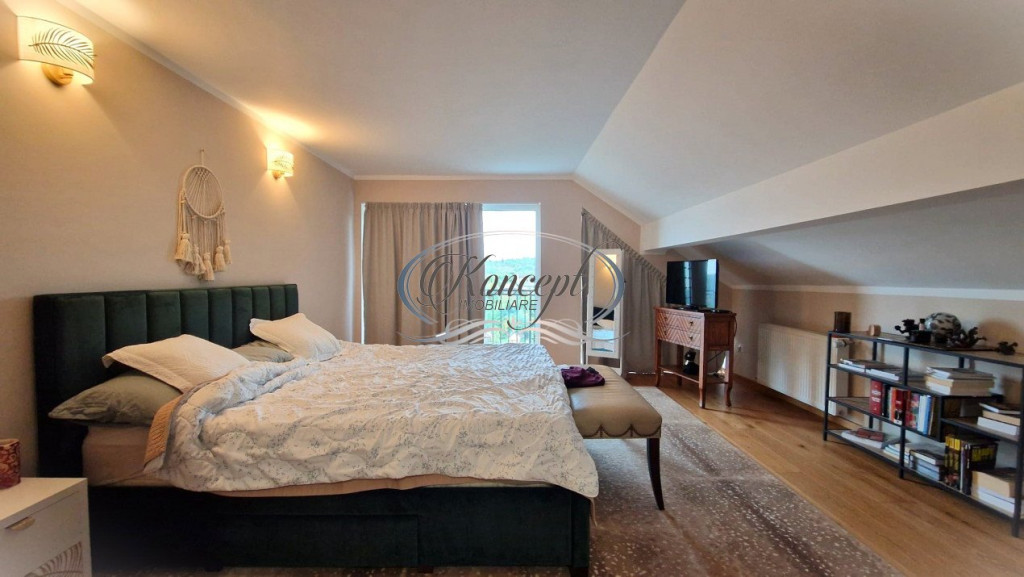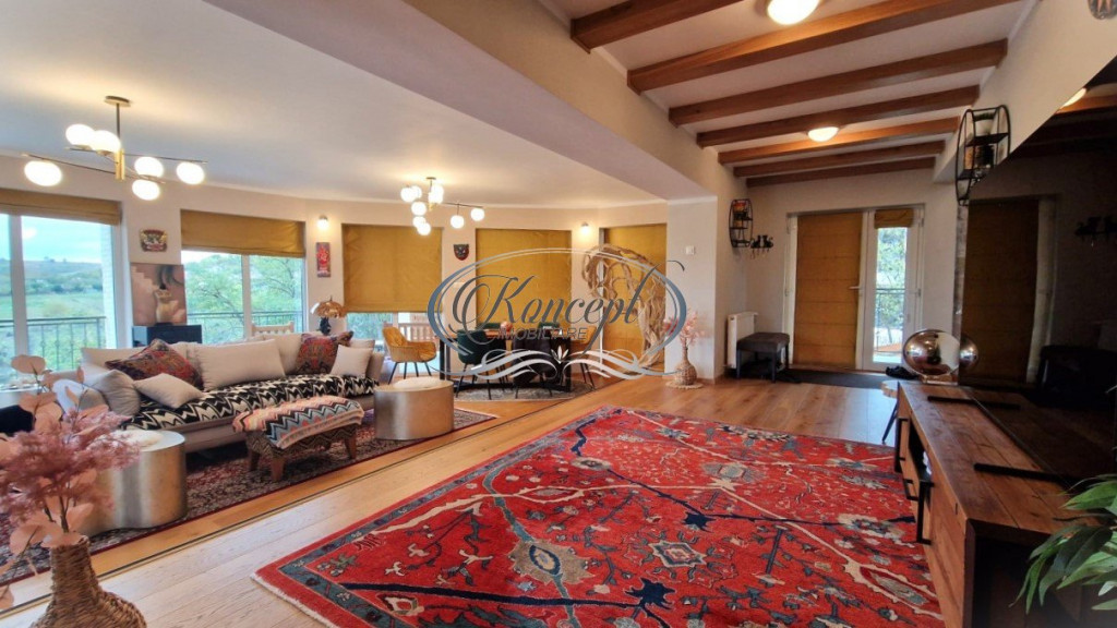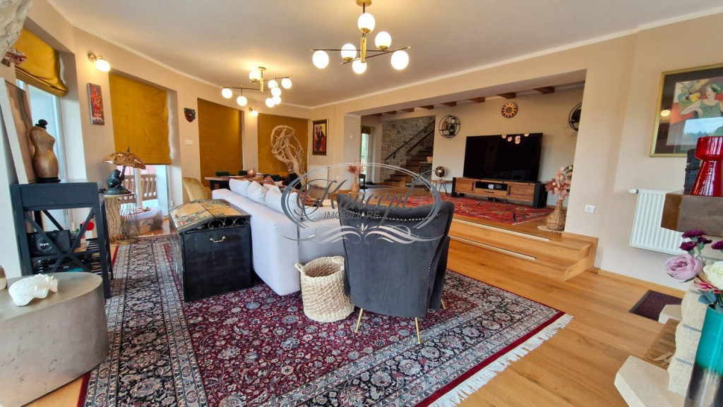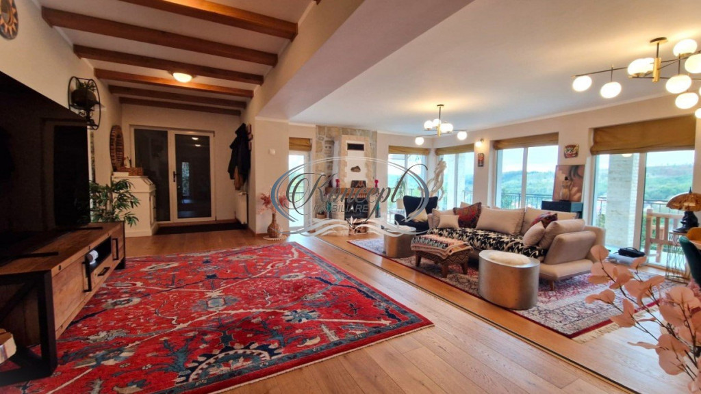 Koncept Imobiliare va ofera spre vanzare o casa individuala deosebita, situata in Feleacu, intr-o zona retrasa de la strada principala, cu o panorama spectaculoasa. Imobilul, avand suprafata utila de 294 mp si aproximativ 140 mp terase este dispus D+P+E, iar terenul are suprafata de 1.763 mp. Casa este compartimentata astfel: Demisol- 2 camere, baie si camera tehnica; Parter- living foarte spatios cu suprafata vitrata foarte mare oferind o panorama de exceptie, bucatarie separata, baie, garaj si terasa; Etaj- 2 dormitoare, birou, baie, dressing walk-in si balcon cu acces din ambele dormitoare. Casa se remarca prin armonia spatiilor gandite in detaliu, finisate cu piatra naturala si lemn, intr-un mod simplu, dar placut si foarte primitor, oferind siguranta, intimitate si personalitate. Calitatea constructiei, a finisajelor si mobilierului, vin doar sa intregeasca conceptul de casa primitoare intima si confortabila. Incalzirea se face cu centrala termica proprie (pe gaz)+semineu pe lemne in living. La demisol se poate amenaja un apartament independent de restul casei, cu 2 camere, bucatarie si baie. Potrivita celor care isi doreste o casa cu adevarat exceptionala cu o panorama de vis, aer curat si foarte intima, la doar cateva minute de Cluj-Napoca. Pentru informatii complete, pentru programarea unei vizionari sau pentru a afla oferta noastra completa nu ezitati sa ne contactati telefonic, prin email sau la sediul agentiei noastre pe strada Aviator Badescu nr. 19, Cluj-Napoca Id intern: P19784