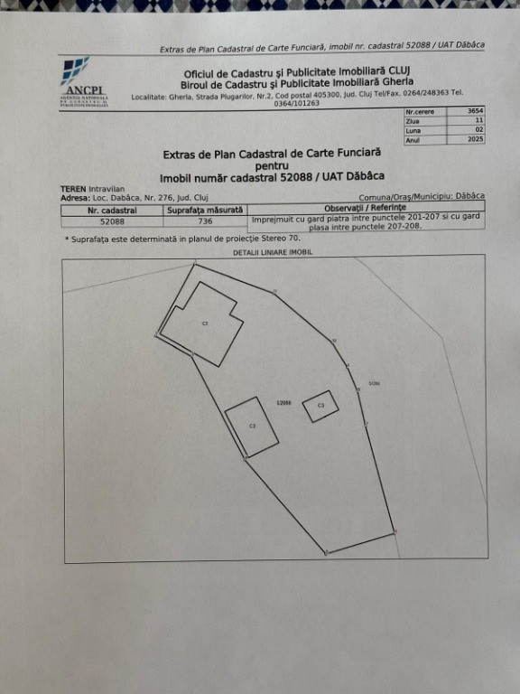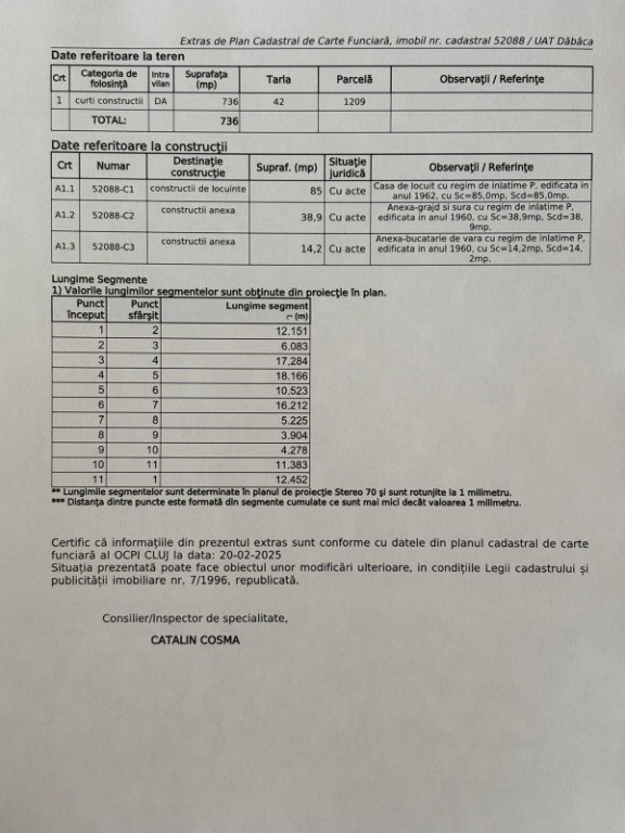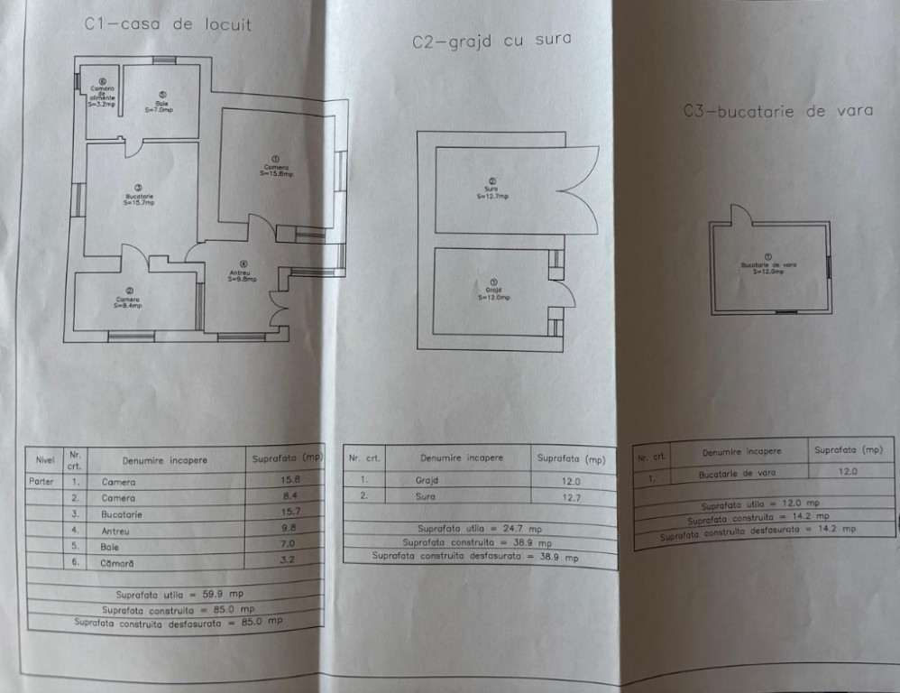 Se vinde casa de locuit in comuna Dabaca, jud Cluj, cu suprafata utila de 65 mp, compartimentata dupa cum urmeaza: hol de intrare, 3 camere, baie si camara. Constructie solida cu ziduri din piatra, acoperis din tigla edificata pe un teren de 735 mp aflat la drumul principal. Imobilul este racordat la curent monofazic, este alimentat cu apa din fantana proprie prin intermediul unui hidrofor, iar canalizarea este asigurata de o fosa septica. Este posibila si racordarea la utilitatile comunei (apa si canalizarea comunei se afla la limita de proprietate). Pe linga imobilul principal, pe teren mai sunt edificate un grajd in supfata de 25mp, o bucatarie de vara de 12 mp, o pivnita, si un garaj. Imobil intabulat, acte ok, ocupabil imediat. Pret 62 000 euro. Mai multe detalii la telefon 0757 770247.