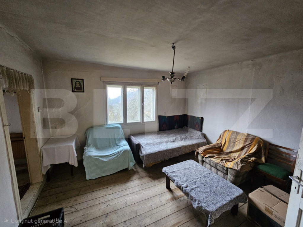 Blitz vă propune spre vânzare o casă de munte cu potențial excelent de renovare, situată într-o zonă retrasă, liniștită, cu o priveliște uimitoare către munți și dealuri împădurite – ideală pentru cei care caută aer curat, intimitate și relaxare în mijlocul naturii. Imobilul are o suprafață utila de aproximativ 50 mp și este compartimentat în parter și demisol. La parter se regăsesc două camere luminoase, bucătăria și o cămară practică pentru depozitare. Demisolul oferă spațiu suplimentar ce poate fi amenajat după preferințe – fie pentru depozitare, fie ca zonă tehnică sau spațiu de relaxare. Casa este parțial mobilată și utilată, oferind o bază bună pentru reamenajare. Încălzirea se realizează în prezent prin șemineu, creând o atmosferă caldă și primitoare în sezonul rece. Proprietatea dispune de utilități esențiale: curent electric și apă prin cădere, trasă până în curte. Terenul aferent are o suprafață generoasă de 7.297 mp, oferind multiple posibilități – grădină, livadă, foișor, spațiu pentru animale sau chiar dezvoltare turistică. În plus, proprietatea include două anexe ce pot fi utilizate pentru depozitare sau alte activități gospodărești. Accesul este facil, cu drum asfaltat și o deschidere mare la stradă, ceea ce adaugă un avantaj important atât pentru uz rezidențial, cât și pentru o eventuală investiție. O proprietate cu farmec autentic, ce așteaptă să fie readusă la viață și transformată într-o casă de vacanță de poveste sau într-un cămin liniștit la munte. Cod ofertă / ID BLITZ: P165961 Id intern: P165961