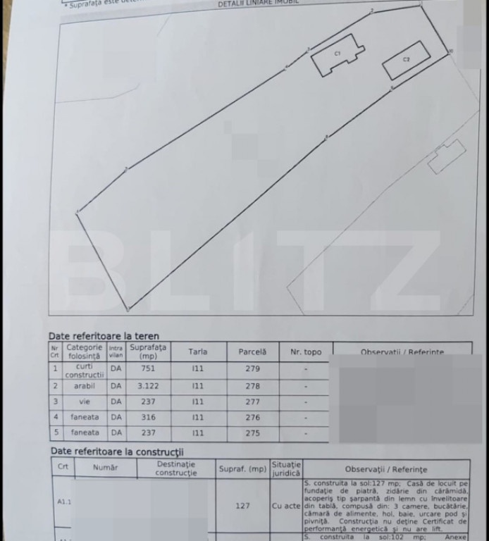 Blitz va propune spre vanzare casa cu 3 camere in sat Barai, comuna Caianu. Casa cu o suprafata utila de 104mp si suprafata construita de 127mp, compartimentata in 3 camere, 1 bucatarie, 1 camera de alimente, 1 hol. 1 baie cu geam si un pod cu urcare din casa si 1 pivnita. De mentionat ca accesul se face din drum asflaltat, iar casa este pe o structura de piatra si zidarie de caramida cu acoperis tip sarpanta din lemn cu tabla. Proprietarea este echipata cu curent si apa de la sistemul public, gazul este tras la poarta ( nu este racordat in casa ). Accesul catre proprietate este unul facil, iar privelistea din gradina cu suprafata generoasa este una superba. Amintim si un teren de 4663mp, fertil, intretinut cu rasaduri si pomi fructiferi. Intreaga proprietare mai are in CF si o anexa gospodareasca cu o suprafata de 102mp construiti, din BCA si lemn cu acoperis tip sarpanta din lemn si tabla compusa din 1 grajd si 1 sura. Actele sunt perfectate, avand CF indiividual pe fiecare unitate in parte si nu sunt sarcini. Pentru mai multe informatii va stam la dispozitie. Cod ofertă / ID BLITZ: P155659 Id intern: P155659