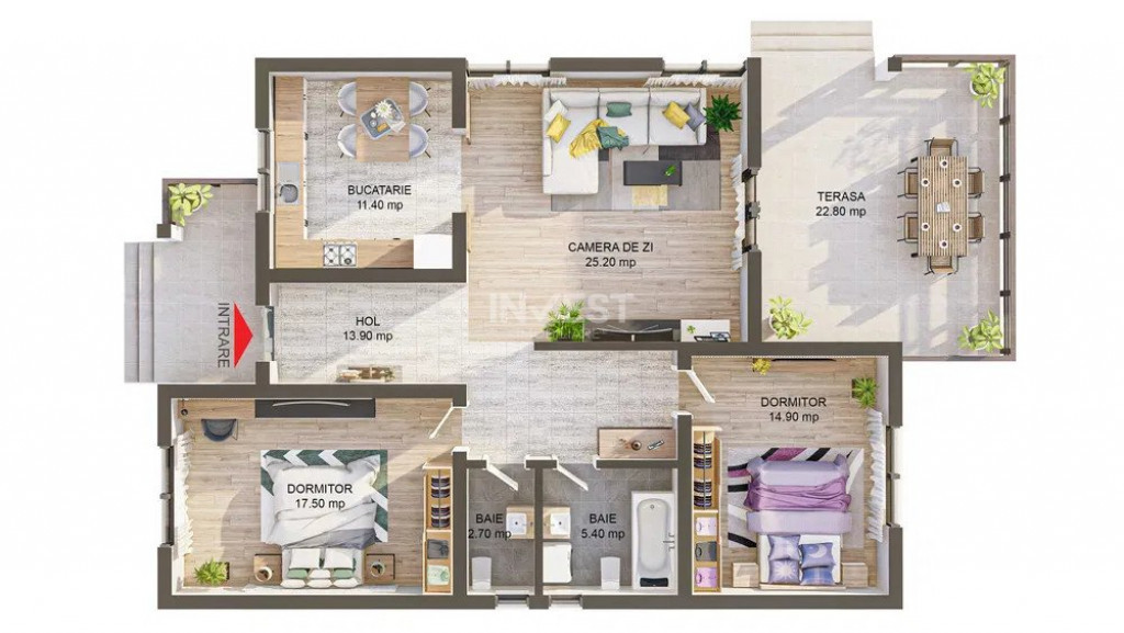 • Terasă acoperită: 23 mp (80% acoperită), perfectă pentru relaxare