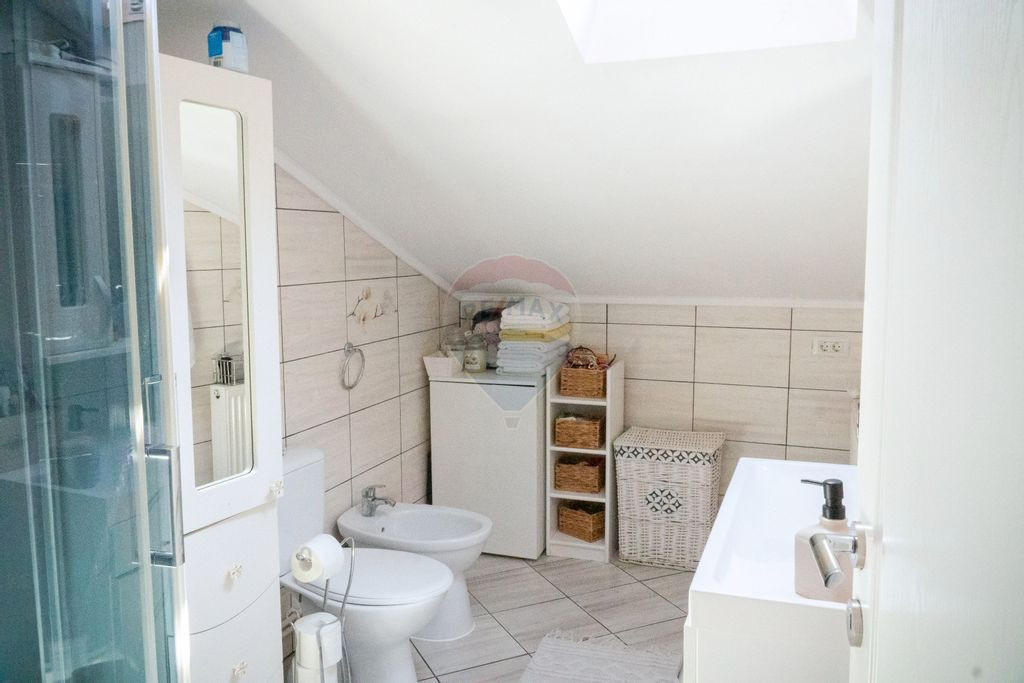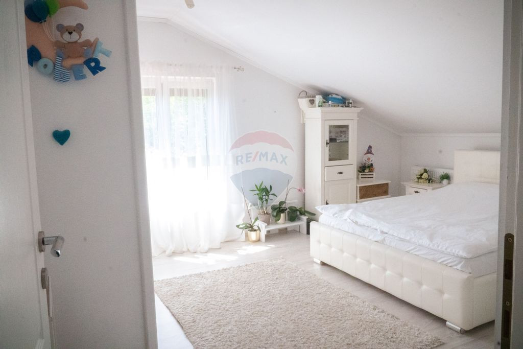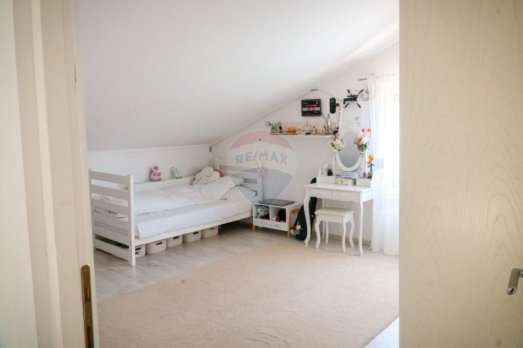 Etajul casei oferă intimitatea necesară unei familii numeroase: patru dormitoare luminoase și o baie spațioasă, toate scăldate în lumină naturală datorită ferestrelor generoase amplasate în acoperiș – o caracteristică ce conferă un farmec aparte și o atmosferă relaxantă.
