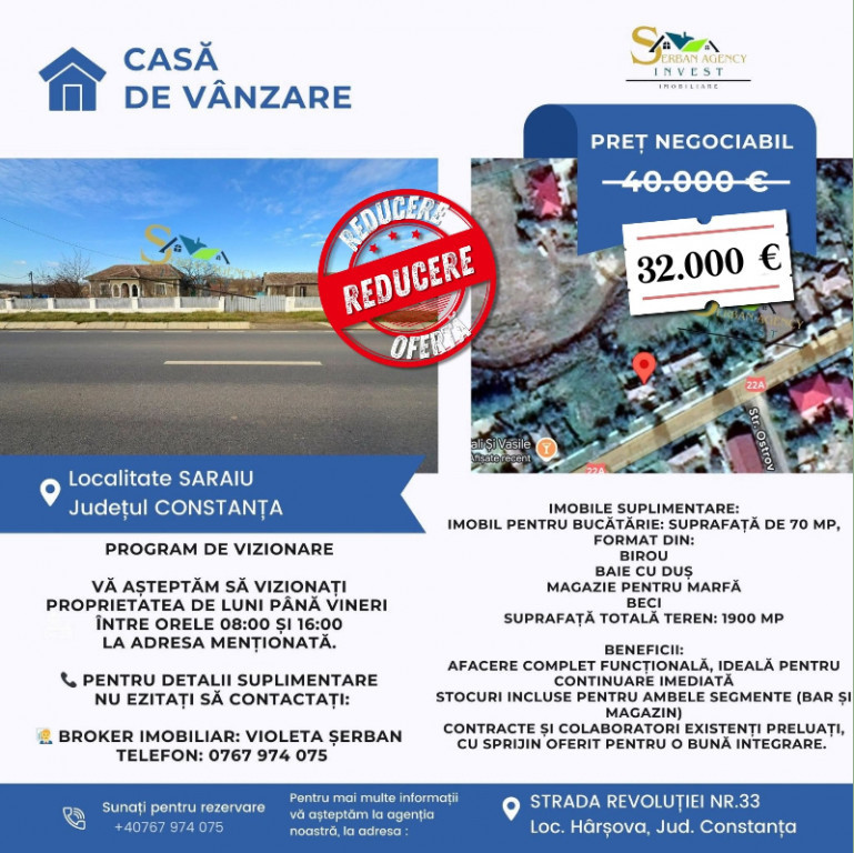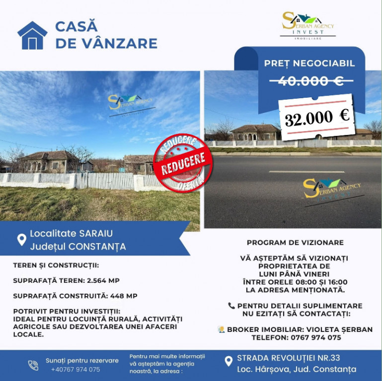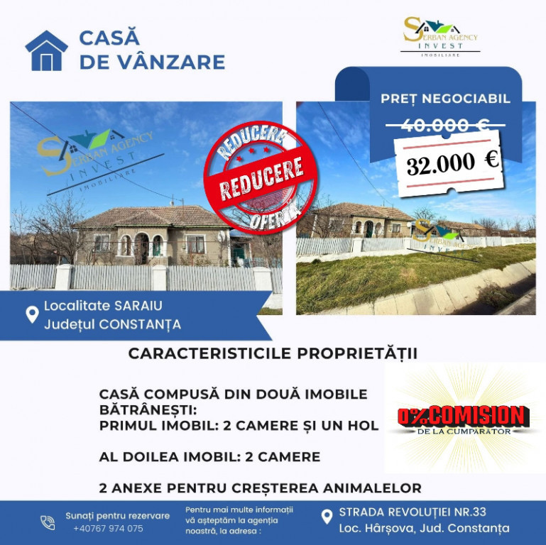 ‼️ REDUCERE DE 8.000 € ‼️ Casă bătrânească de vânzare în Saraiu, jud. Constanța Preț NOU: 32.000 € (negociabil) Preț vechi: 40.000 € Caracteristici: Compusă din două imobile bătrânești: Primul imobil: 2 camere și un hol Al doilea imobil: 2 camere 2 anexe pentru creșterea animalelor Teren și construcții: Suprafață teren: 2.564 mp Suprafață construită: 448 mp Potrivit pentru investiții: Ideal pentru locuință rurală, activități agricole sau dezvoltarea unei afaceri locale