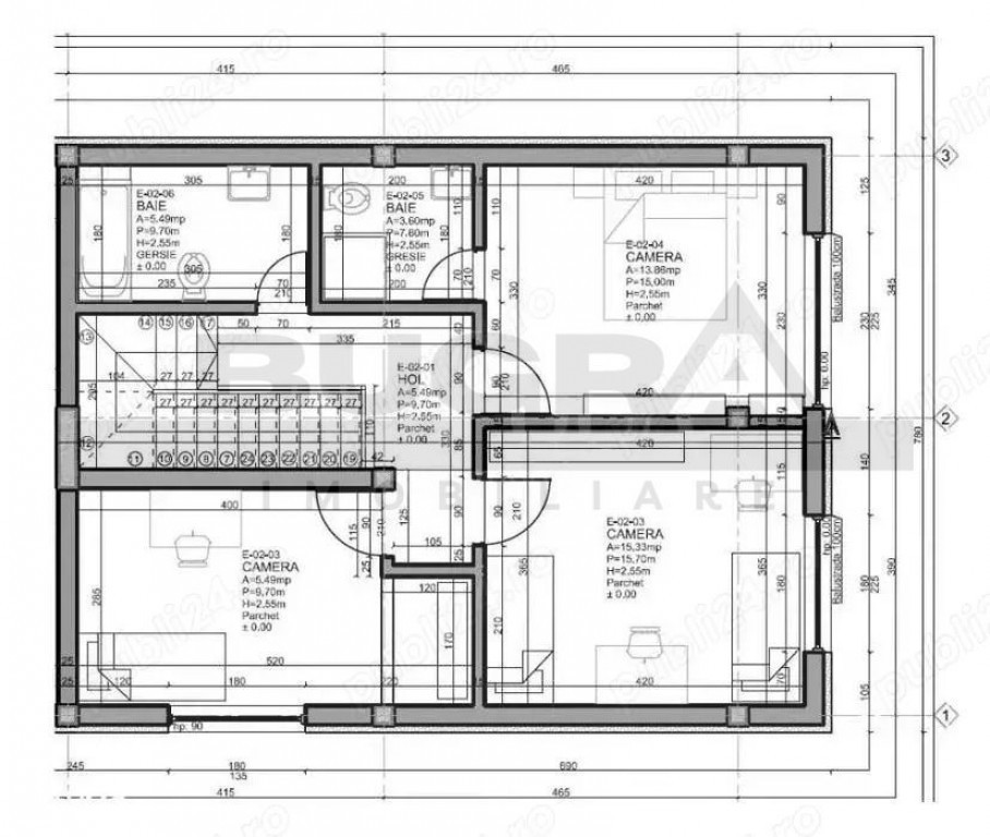 Etaj: un dormitor matrimonial cu baie plus alte 2 dormitoare si o baie.
