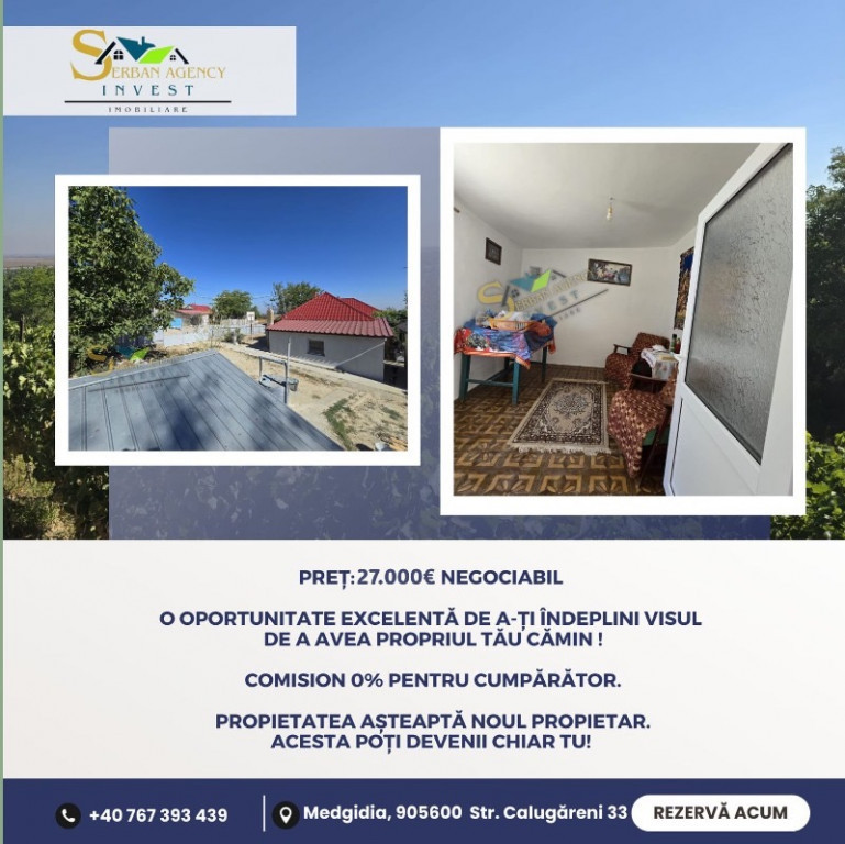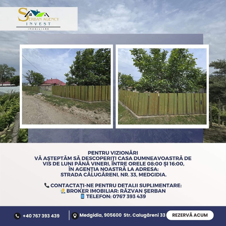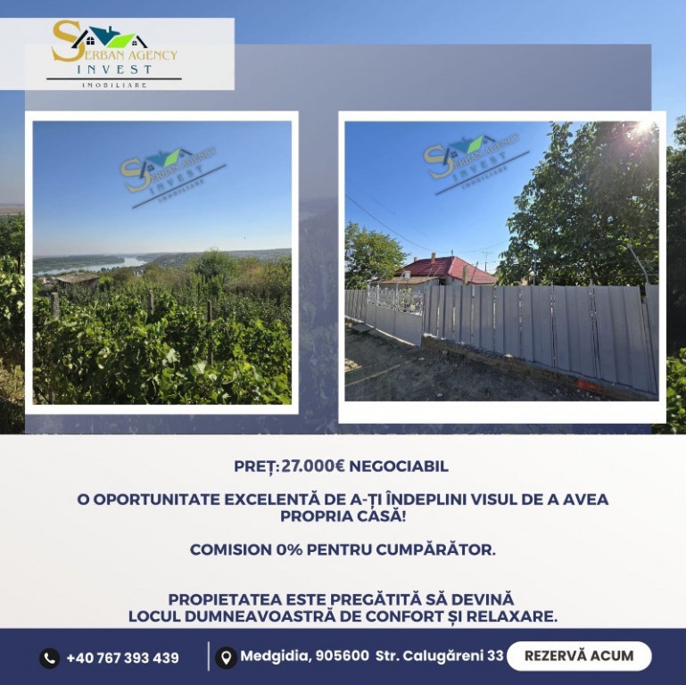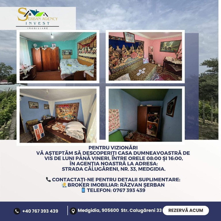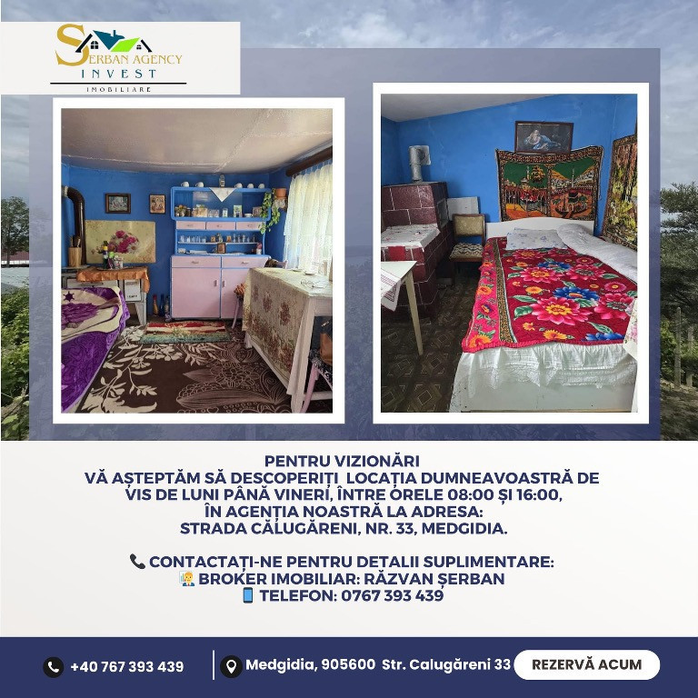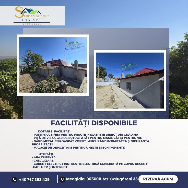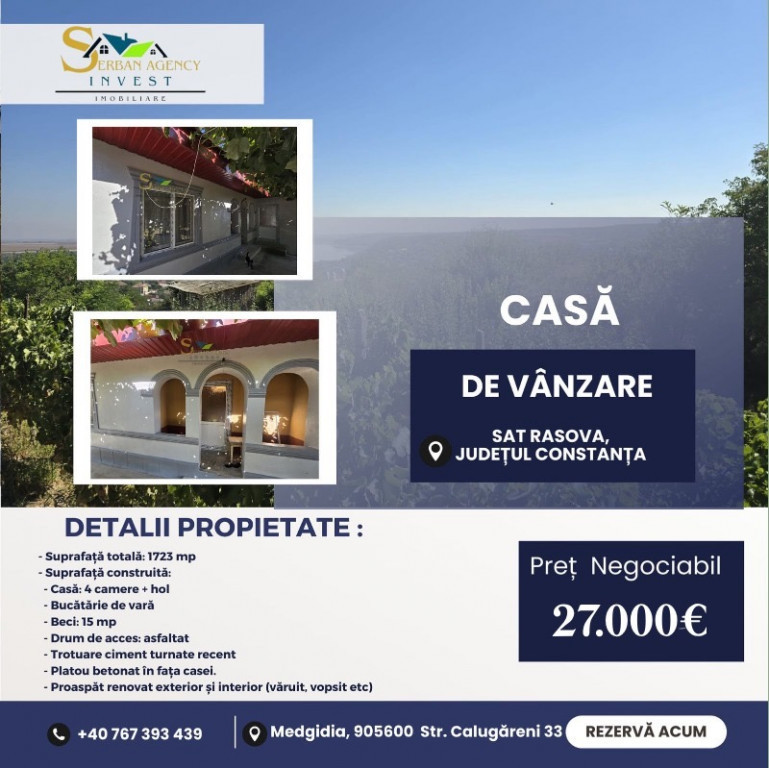 Casă de Vis în Satul Rasova, Constanța – Oportunitate UNICA SE DA POSIBILITATEA SI DE PLATA IN 2 RATE NOTARIALE ! Descoperă o casă cu suflet, perfectă pentru relaxare sau locuință permanentă, situată în Comuna Rasova, jud. Constanța. Stil rustic, atmosferă caldă, grădină generoasă și posibilități multiple: locuință familială, casă de vacanță sau pensiune agroturistică. * Suprafața teren: 1.723 mp * Suprafața construită: 96 mp (casă cu 4 camere + hol) * Bucătărie de vară ideală pentru găzduiri și mese în aer liber * Beciu spațios: 15 mp * Acces facil — drum asfaltat, trotuare și platou betonate recent * Renovată complet recent, atât interior, cât și exterior — gata de mutat! Interioare și Modernizări: - Semi-mobilată, cu bucătărie proaspăt renovată (rigips, tencuială, faianță) - Bucătărie de vară renovată, cu sobă teracotă refăcută - 3 camere cu dușumea din lemn masiv - Dormitor principal și hol renovate complet - Acoperiș nou, geamuri termopan cu plase anti-insecte - Instalație electrică nouă - Camere de supraveghere video 24/24 Facilități Exterioare: - Pomi fructiferi și viță de vie cu 350 de butuci - Gard metalic proaspăt vopsit pentru intimitate - Spații de depozitare pentru unelte și echipamente ???? Utilități Complete: - Apă curentă - Canalizare - Curent electric (instalație pe cupru nouă) - Cablu TV și Internet Preț: 27.000 € NEGOCIABIL COMISION 0 pentru cumpărător.
