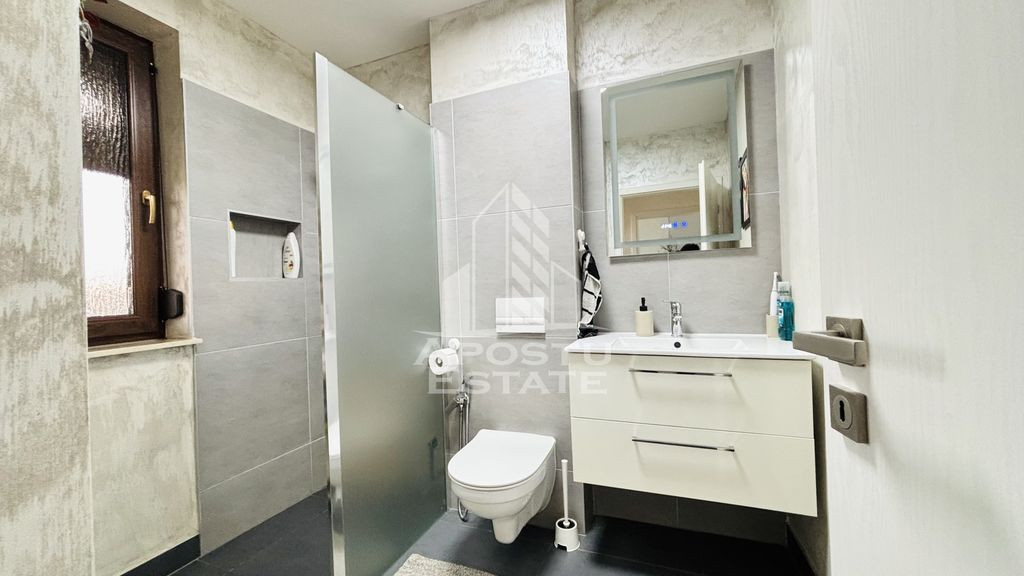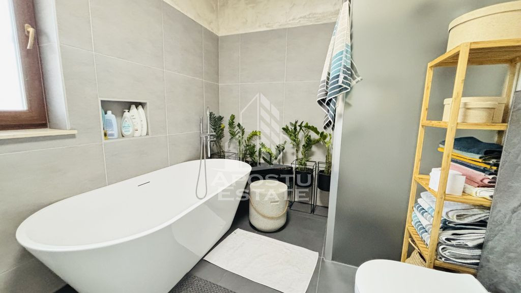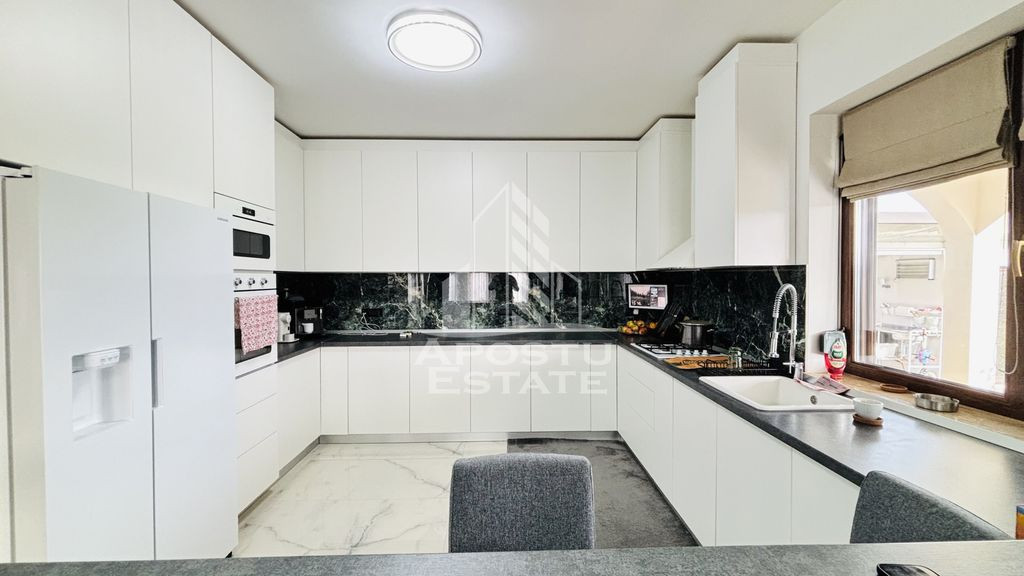 APOSTU ESTATE va propune spre vanzare o casa moderna si spatioasa, construita in 2021, situata in localitatea Dinias. Datorita atentiei la fiecare detaliu, aceasta casa efectiv te face sa te “indragostesti” si iti ofera un vibe aparte. Veti putea simti acest sentiment la vizionare. Casa se vinde mobilata utilata complet, exact ca in poze, cu absolut toate detaliile. Aceasta proprietate ofera confort, siguranta si tehnologie moderna, fiind ideala pentru o familie care isi doreste spatiu generos si facilitati de ultima generatie. Detalii proprietate: • Suprafata teren: 796 mp • Suprafata construita: 160 mp la sol • Suprafata desfasurata: 255 mp (inclusiv garaj si terasa de 30 mp) • An constructie: 2021 Dotari si detalii tehnice: • Rulouri si plase de insecte la toate geamurile • Finisaje premium • Inaltime tavan la parter de 2,80 m • Incalzire: Centrala termica de 30 KW, butelie de gaz de 3000 l • Climatizare: Aer conditionat 24.000 BTU • Securitate: 9 camere de supraveghere, alarma, senzor de fum, video interfon, sisteme Ring americane • Automatizari: Casa beneficiaza de sisteme SMART controlabile din telefon. Porti si usa garajului sunt controlate electric • Utilitati: Canalizare, apa, curent trifazic, statie de incarcare electrica pentru masini Compartimentare: Parter: • Hol de acces • Living cu bucatarie open space • Dormitor • Baie • Camera tehnica spatioasa/anexa din BCA cu baie Etaj: • 3 dormitoare (unul matrimonial cu balcon) • Baie spatioasa cu dus si cada • Acces la pod pe toata suprafata casei Localizare: Casa este situata in Dinias, cu acces rapid pe 3 rute catre Timisoara prin Sanmihai, Peciu si Sacalaz. Drumul din fata casei pana la Shopping City nu ar trebui sa dureze mai mult de 15-20 minute. Pentru mai multe detalii sau pentru a programa o vizionare, nu ezitati sa ne contactati!