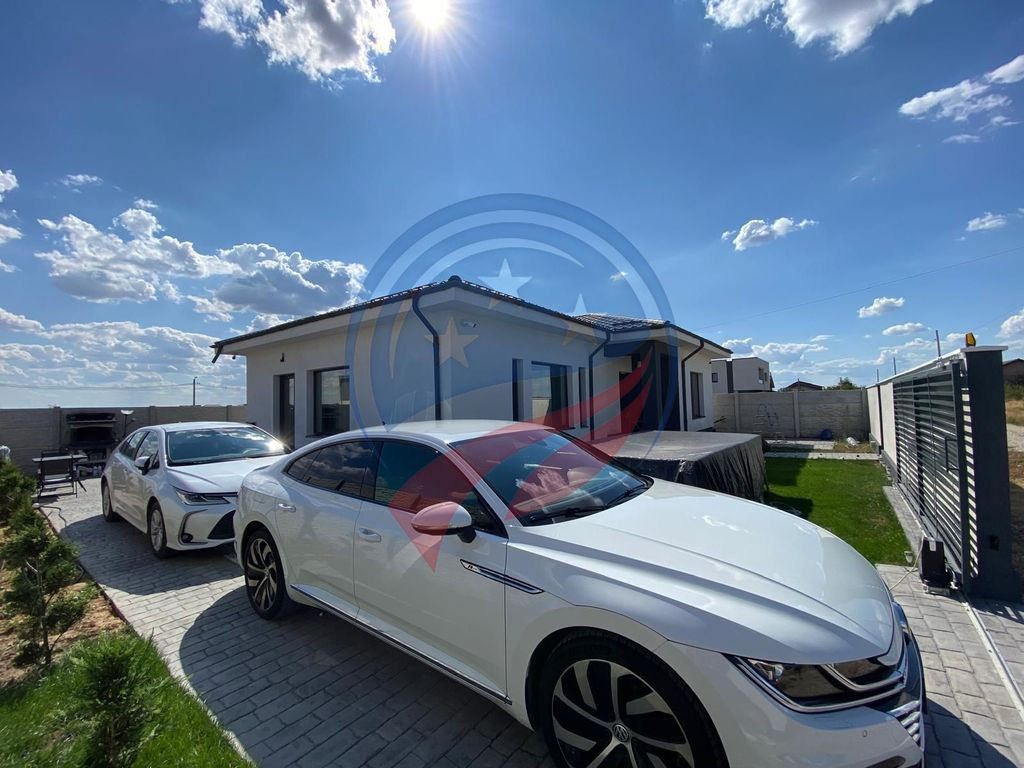 Curtea este amenajata si decorata cu beton amprentat , zona cu piscina, parcare pentru doua autoturisme, si zona verde.
