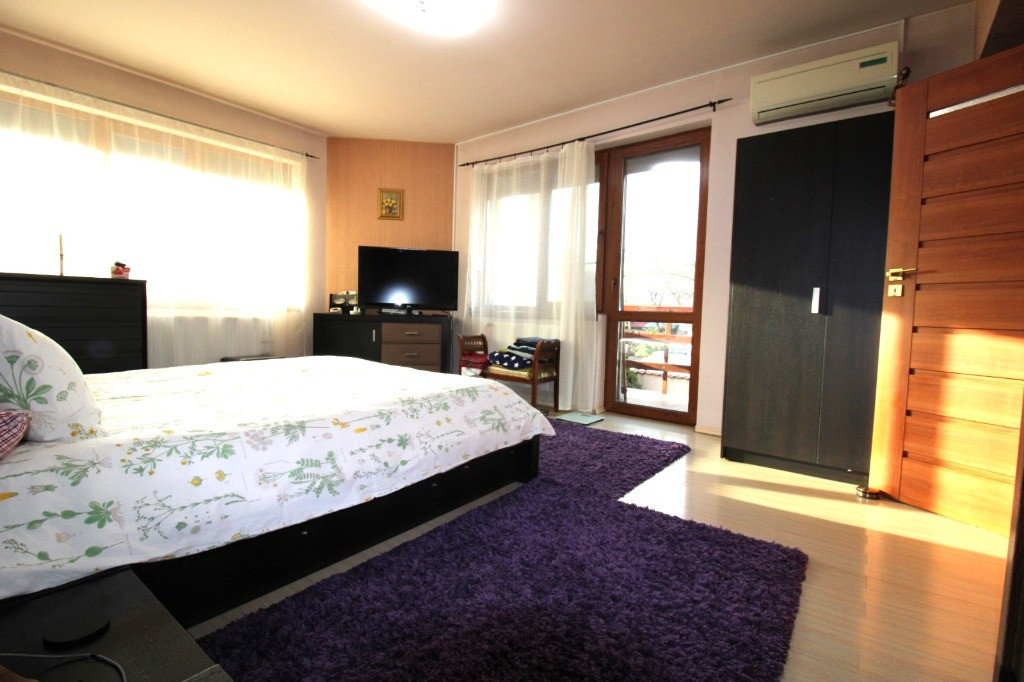 Casa in zona Micro 17, construita in 2008 pe o structura din cadre de beton si caramizi de tip Poroterm, este acoperita cu tabla tip Lindab si izolata cu polistiren de 10 cm. Toate geamurile au rulouri exterioare actionate electric. Terenul aferent constructiei este in suprafata de 436 mp cu o deschidere de 27 m. Imobilul are o suprafata de 261 mp, cu o amprenta de 131. Casa este dispusa pe parter si etaj. La parter avem: living, dormitor, bucatarie, camera tehnica din care este accesul in beci si baie. La etaj avem: 3 dormitoare, dintre care unul are baie proprie si dressing, baie, sala de sport si camera cu scara de acces in pod. Proprietatea are urmatoarele anexe: parcare in curte, terasa, un foisor, o baie si anexa gandita ca magazie. Casa este racordata la: curent electric (380v), sunt montate pe acoperis panouri solare de 22 kv, apa care este conectata la o statie de durizare, gaze si canalizare. Incalzirea, si apa calda se obtin cu ajutorul unei centrale termice pe gaze. Proprietatea se vinde mobilata si utilata complet. Imobilul are sistem de supraveghere video si alarma. Curtea interioare este amenajata cu aleii, 2 locuri de parcare si gazon. Proprietatea are in imprejurimi zone comerciale, scoli, zone verzi, restaurante, zone de agrement. Se accepta orice forma de creditare.