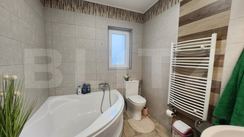 :Blitz vă oferă spre vânzare o casă la preț de apartament! Proprietatea este amplasată pe un teren de 317 mp și are o suprafață construită de 142,5 mp, dintre care 98 mp utili. În plus, imobilul dispune de un garaj închis, foarte spațios, precum și de o bucătărie de vară de 12 mp, cu acces direct către terenul din spatele casei. Garajul are o suprafață utilă de 20 mp. Caracteristici construcție: Fundație din beton Structură din cărămidă de 30 cm Acoperis de tigla din beton Izolație exterioară de 10 cm Construcție finalizată în 2023 Geamuri termopan, dublu strat Acces pe drum pietruit Utilități: Casă branșată la apă și curent electric Nu există gaz în zonă Încălzirea se face cu centrală pe lemne (centrala nu este inclusă în preț) Compartimentare: Parter: bucătărie open-space cu living, baie, cameră Etaj: două camere și o baie Proprietatea se vinde la cheie, gata pentru a fi locuită Cod ofertă / ID BLITZ: P160003 Id intern: P160003