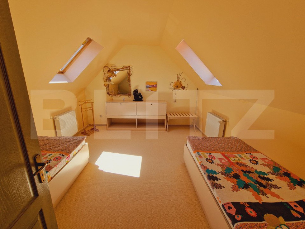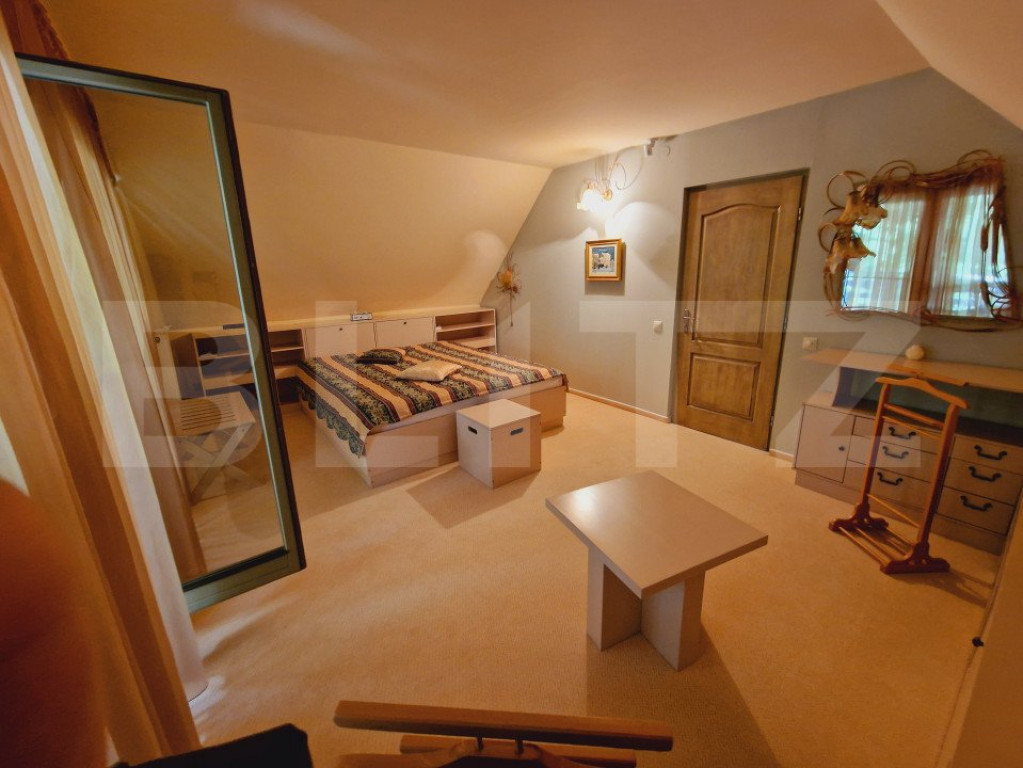 BLITZ propune spre vanzare, casă tip duplex deosebită, construită în 2004, se întinde pe un teren de 1000 mp și oferă o suprafață construită de 673 mp și utilă de 494 mp. Structurată pe demisol, parter și mansardă, locuința include 12 camere spațioase, dintre care 8 dormitoare și 8 băi moderne, asigurând confort și intimitate pentru toți membrii familiei. Facilitățile de lux precum sauna, sala de joacă și crama adaugă valoare și funcționalitate casei. Exteriorul impresionează printr-o curte superbă, ideală pentru relaxare, oferind o priveliște încântătoare spre pădure, perfectă pentru cei care apreciază liniștea și natura. Această proprietate este alegerea ideală pentru o familie numeroasă sau pentru cei care caută un spațiu de locuit elegant și bine dotat. Pentru mai multe detalii nu ezitati sa ne contactati. Cod ofertă / ID BLITZ: P126671 Id intern: P126671