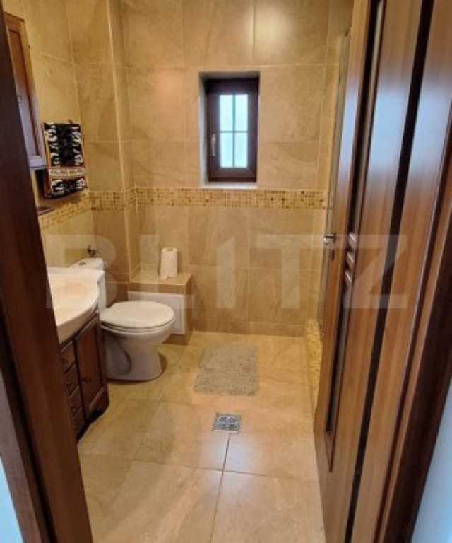 Baie mare, echipată cu lavoar dublu, WC, bideu și cadă, ideală pentru confortul zilnic