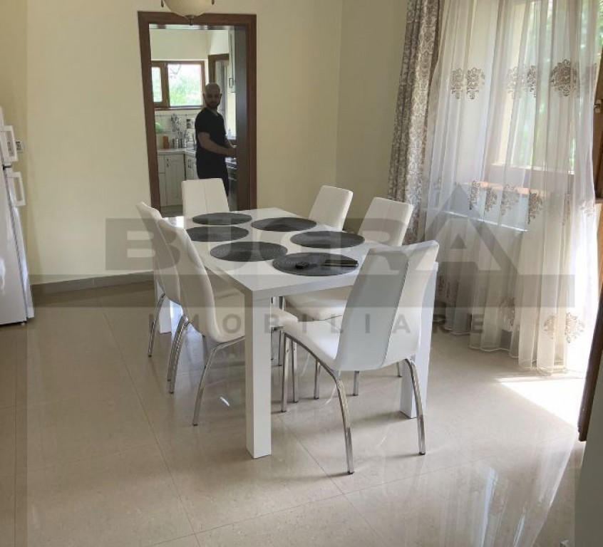 Bugra Imobiliare propune spre inchiriere o casă individuala situată pe strada Eugen Ionesco, în inima cartierului Europa – una dintre cele mai căutate și apreciate zone din Cluj. Cartierul Europa este recunoscut pentru calmul său, priveliștile frumoase și accesul rapid către oraș, fiind o zonă predominant de case, ideală pentru cei care vor confort, intimitate și mobilitate. În apropiere găsești stații de autobuz, magazine și toate facilitățile necesare, ceea ce face ca această proprietate să fie alegerea perfectă pentru familii sau pentru cei care își doresc un stil de viață echilibrat. Compartimentare ideală, gândită pentru confort: Parter: Living spațios și luminos Bucătărie cu zonă dedicată pentru dining Garaj cu acces direct în casă Baie Hol generos Terasă Subsol util Etaj: 3 dormitoare bine dimensionate 2 băi 4 balcoane Hol mare, perfect ca spațiu de relaxare sau birou La exterior, te întâmpină o curte amenajată, ideală pentru timp petrecut în aer liber, loc de joacă pentru copii sau momente de relaxare. Această casă combină poziționarea excelentă din cartierul Europa cu o compartimentare funcțională și spații generoase — o proprietate rară, într-o zonă extrem de dorită.