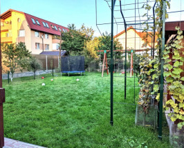 Grădină amenajată: pomi fructiferi, viță de vie, foișor din lemn, plus o cămară anexată.