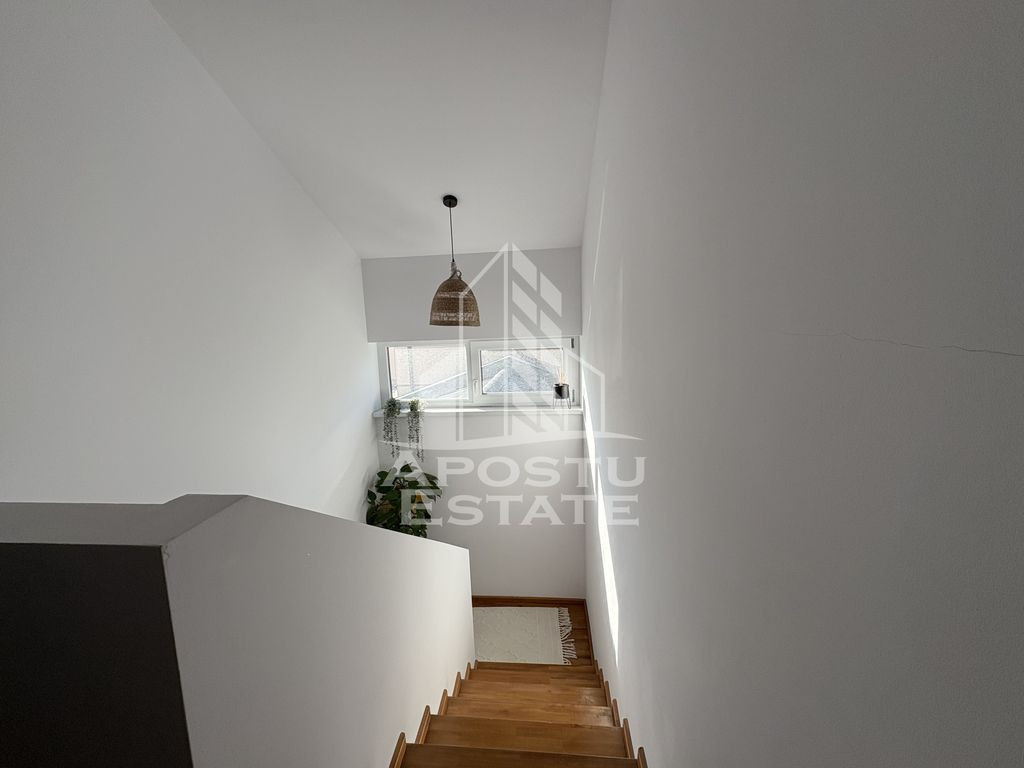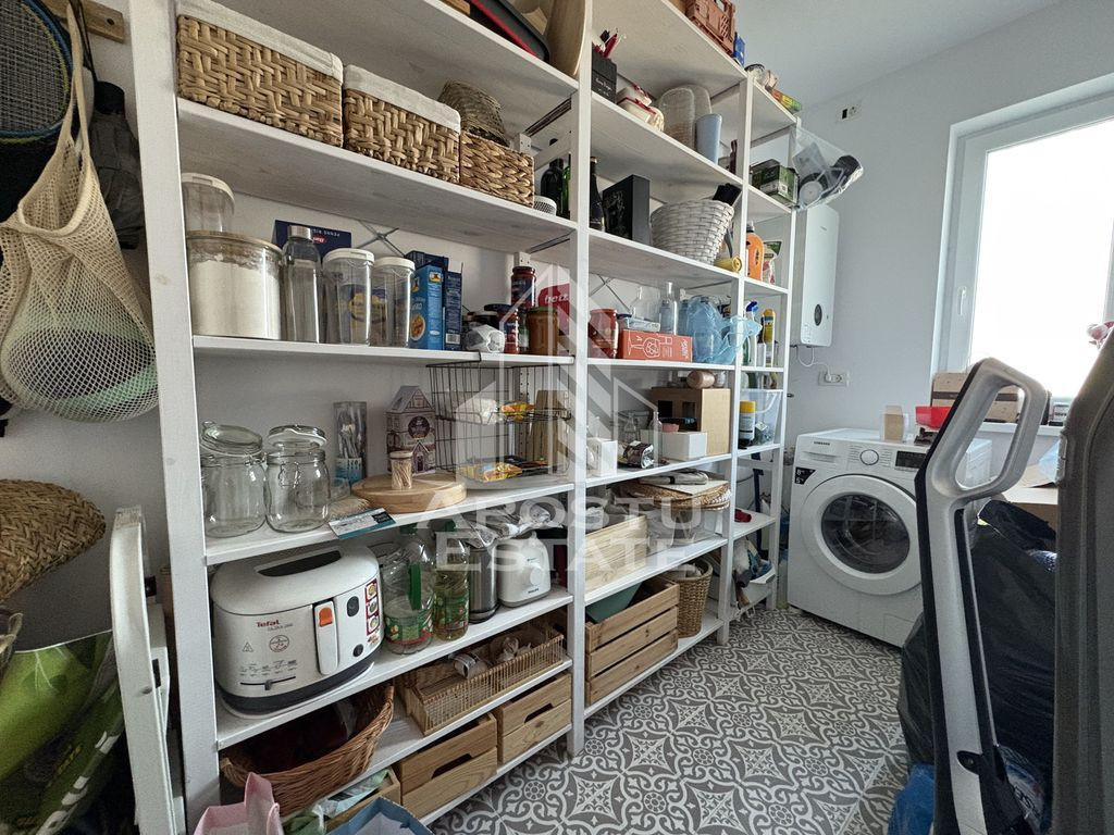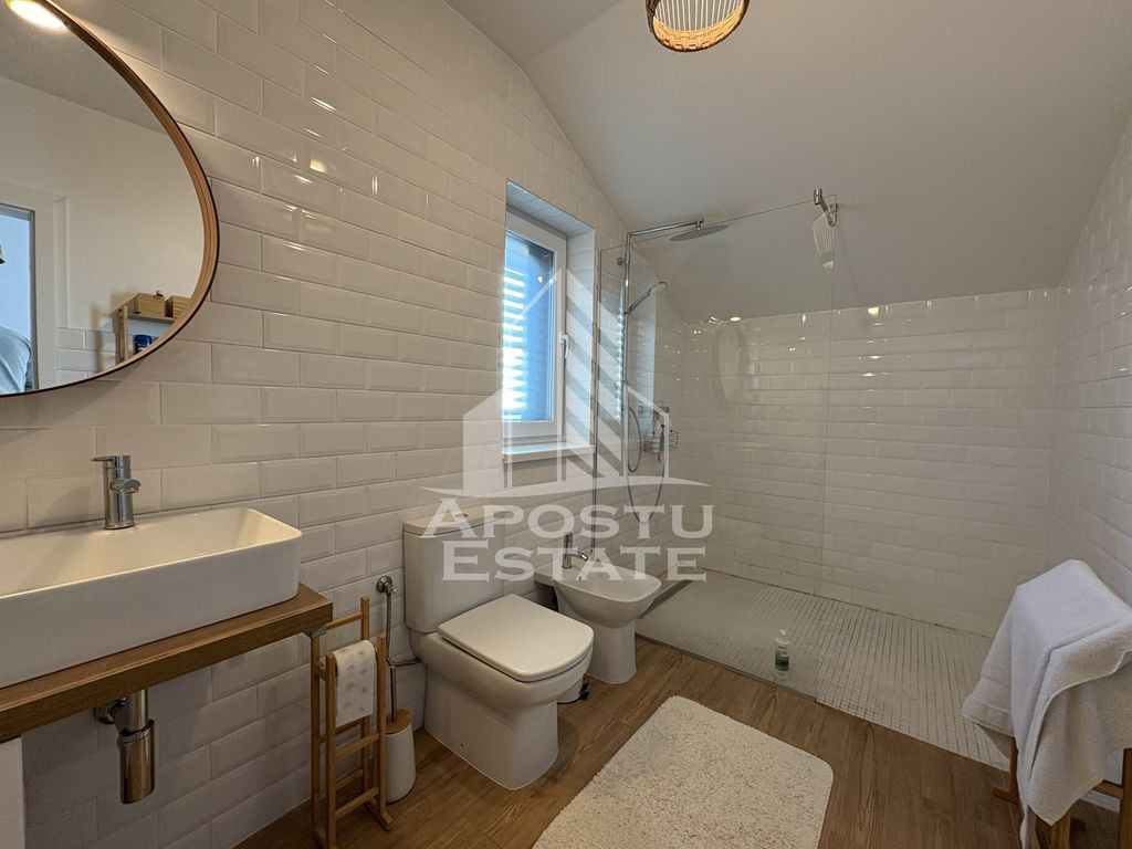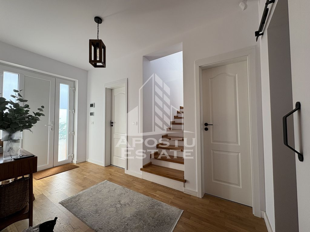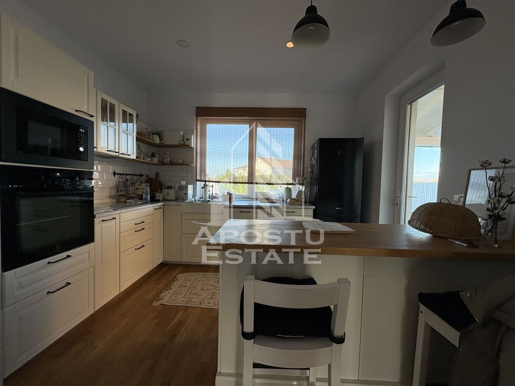 De vanzare – Casa individuala in cartier Serena 2, Mosnita Veche Apostu Estate va propune spre vanzare o casa individuala, situata in cartierul Serena 2, Mosnita Veche. Finalizata in decembrie 2020, aceasta proprietate ofera un spatiu generos si dotari premium, fiind pregatita pentru noii proprietari. Caracteristici principale: • Suprafata utila: 120 mp + terasa si garaj • Suprafata teren: 608 mp • Incalzire in pardoseala • Geamuri tripan cu site si obloane din aluminiu • Termostat de ambient in fiecare camera • Acoperis din tigla de beton, izolatie 10 EPS 80 • Casa se vinde complet mobilata Compartimentare: Parter: • Living spatios • Dining • Bucatarie inchisa cu usa culisanta, iesire pe terasa si camara • Masina de spalat vase, cuptor cu microunde incorporat, plita • Camera tehnica • Baie cu cada • Spatiu de depozitare sub scara Etaj: • 2 dormitoare • 1 dormitor matrimonial cu dressing • Baie cu cabina de dus • Spatiu de depozitare • Acces in pod Dotari si finisaje: • Scari din lemn masiv • Parchet din lemn stratificat la parter • Sistem video cu 8 camere in jurul locuintei • Poarta de acces auto automatizata • Garaj cu usa automatizata • Pavaj in curte, gazon si anexa pentru depozitare • Sistem de irigatii in toata curtea (fata si spate) • Toate utilitatile disponibile (curent monofazic, apa, canalizare, gaz) Proprietatea se remarca prin spatiile sale bine compartimentate si finisajele de calitate superioara, oferind un confort sporit. Pentru mai multe detalii sau pentru a programa o vizionare, va asteptam cu drag!