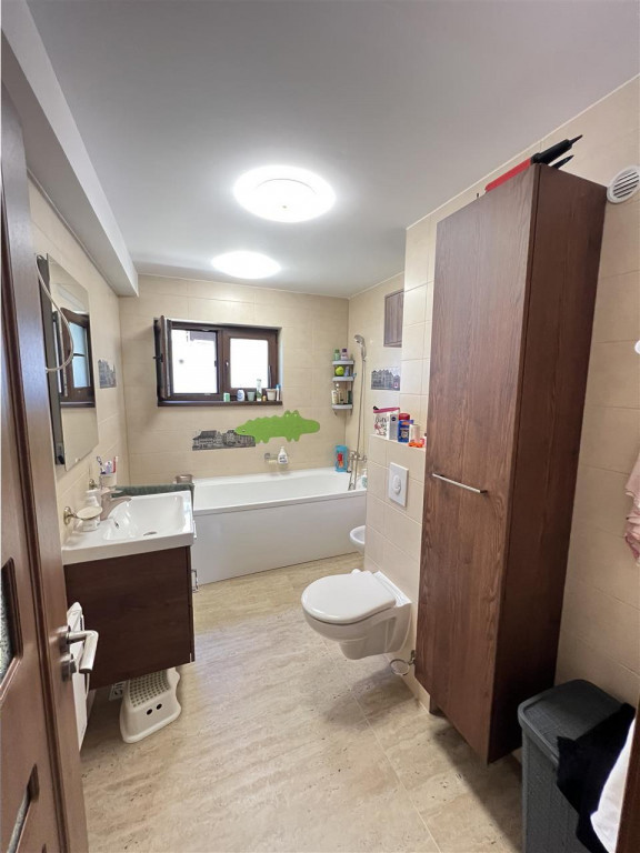 Separat mai detine un pod inalt, cu aceeasi suprafata, dispune de planseu din beton si poate fi transformat cu usurinta intr-un etaj suplimentar, dar si o terasa generoasa de 25 mp, acoperita, in care accesul se face si din living.