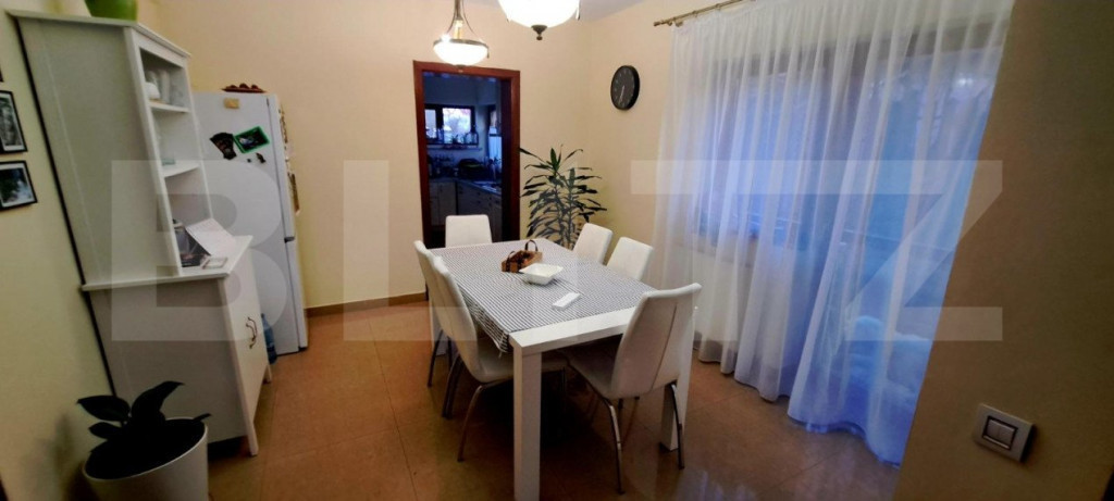 Blitz ofera spre vanzare casa de vanzare individuala în cartierul Europa, in zona strazii Eugen Ionesco, o proprietate eleganta si spatioasa. Aceasta casa deosebita se intinde pe o suprafata utila generoasa de 180 mp, amplasata pe un teren de 370 mp. La parter, vei fi intampinat de un living spatios, imbogatit de un semineu ce adauga un aer intim si reconfortant. Bucataria este moderna si functional, complet echipata pentru a satisface cele mai exigente gusturi culinare. Alaturi se afla un loc de luat masa, perfect pentru a te bucura de mesele in familie sau cu prietenii. Aici gasesti si o baie, pentru confortul tau si al oaspetilor, precum si un hol primitor. Cu o atentie speciala acordata detaliilor, proprietatea beneficiaza si de un dressing, terasa, garaj si doua spatii tehnice, pentru a-ti asigura spatiul de depozitare necesar. La etaj vei descoperi 3 camere luminoase, dintre care un dormitor matrimonial impresionant, dotat cu dressing si baie proprie pentru intimitate si confort sporit. Cele 4 balcoane iti ofera o priveliste panoramica asupra cartierului, aducand lumina si aer proaspat in fiecare camera. Aici gasesti inca doua bai pentru a completa nevoile familiei, alaturi de un hol spatios, ce poate fi amenajat ca si birou sau zona de relaxare. Dotările moderne includ parchet din lemn masiv , uși și ferestre termopan de calitate superioară, sistem de alarmă, video interfon și camere video, oferind un nivel ridicat de confort și siguranță. Curtea acestei proprietati este amenajata cu grija, oferindu-ti un spatiu verde generos pentru relaxare si recreere in aer liber. In plus, beneficiezi de 4 locuri de parcare dedicate, asigurandu-ti comoditatea si accesul facil. Accesul la proprietate se face printr-un drum privat cu bariera, oferindu-ti intimitate si siguranta. Cod ofertă / ID BLITZ: P111400 Id intern: P111400