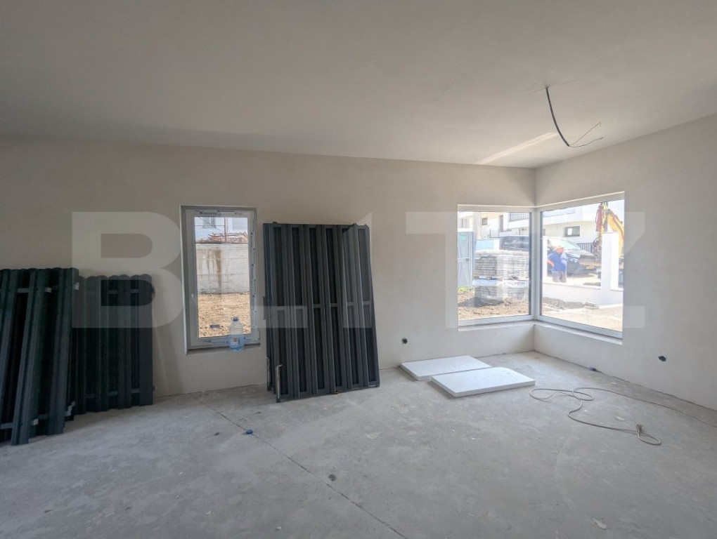 Casă unifamilială nouă, semifinisată – Chinteni, la doar 8 km de Cluj-Napoca Blitz oferă spre vânzare o casă unifamilială, recent construită, situată chiar la intrare în Chinteni, într-o zonă de case noi, retrasă de la strada principală – loc ideal pentru cei care caută liniște, aer curat și o priveliște frumoasă, fără a renunța la proximitatea orașului. Caracteristici generale: Suprafață utilă: 119 mp Garaj de 27 mp + cameră tehnică integrată Teren: 500 mp Predare: Semifinisată Toate utilitățile sunt racordate Construcție din cărămidă, acoperiș țiglă, izolație polistiren 15 cm Compartimentare eficientă: Parter: Living spațios și luminos Bucătărie separată + cămară Baie Terasă în partea din spate Etaj: 3 dormitoare, fiecare cu acces la balcon Dormitor matrimonial cu dressing și baie proprie Baie comună pentru celelalte două dormitoare Pod: Generos, ideal pentru depozitare sau posibil de amenajat ca spațiu suplimentar (birou, cameră hobby etc.) Proprietatea este situată pe o stradă secundară, ferită de agitație, într-o comunitate nouă de case, la doar 8-9 km de centrul Clujului, cu acces rapid și ușor către oraș. Pentru mai multe detalii sau pentru a programa o vizionare, nu ezitați să ne contactați! Cod ofertă / ID BLITZ: P146532 Id intern: P146532