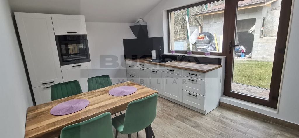 Gradina este amenajata cu spatiu de relaxare, iarba și pomi fructiferi.