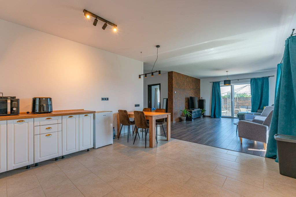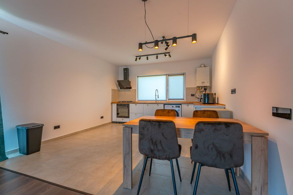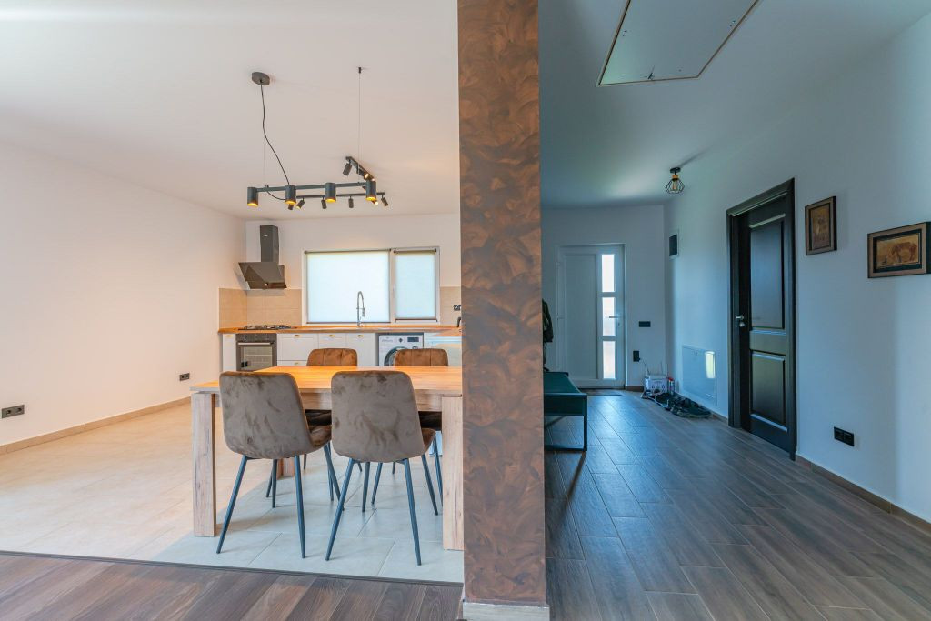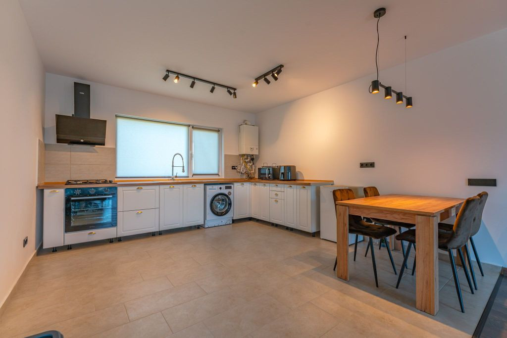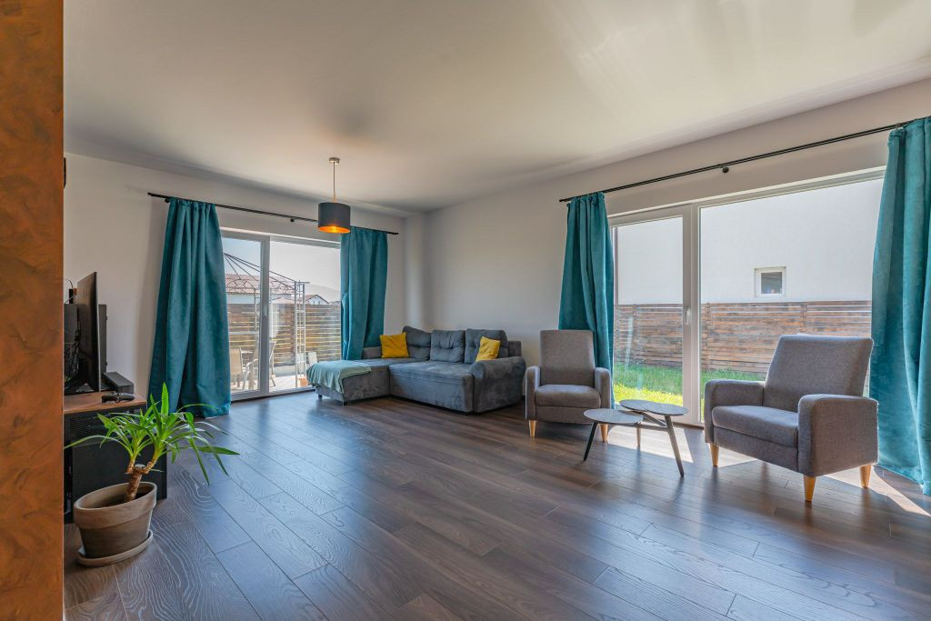 Vă propunem spre închiriere o casă individuală, o construcție finalizată în anul 2023, situată în localitatea Sânpetru, în zona rezidențială Primăverii, pe strada Anotimpurilor. Proprietatea dispune de o suprafață utilă de 95 mp și este amplasată pe un teren de 400 mp. Locuința este compartimentată în 3 camere (o cameră de zi și două dormitoare), o bucătărie și două băi. Casa se închiriază mobilată și utilată, fiind dotată cu televizor, mașină de spălat rufe, cuptor electric și plită pe gaz. Construcția beneficiază de dotări moderne, menite să asigure un confort ridicat: sistem de încălzire prin pardoseală cu centrală termică proprie pe gaz, izolație termică exterioară și ferestre cu geam tripan și tâmplărie PVC. Interiorul este finisat cu parchet, gresie și faianță. Curtea individuală permite accesul auto și parcarea în interiorul proprietății. Accesul se realizează de pe o stradă pietruită. Imobilul este racordat la toate utilitățile necesare: curent electric, apă curentă, canalizare, gaz și fibră optică. Condițiile de închiriere prevăd plata în avans a unei chirii lunare și depunerea unei garanții. Cheltuielile aferente utilităților se achită separat de către chiriaș. Menționăm că animalele de companie nu sunt acceptate în interiorul locuinței. Proprietatea se află în intermediere exclusivă a agenției imobiliare VIPIMOB, iar comisionul pentru chiriaș este de 50% din valoarea unei chirii lunare. Pentru detalii suplimentare sau pentru a programa o vizionare, vă stăm la dispoziție.