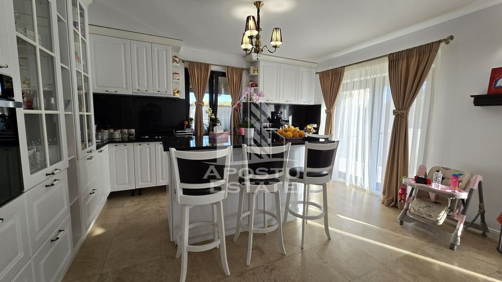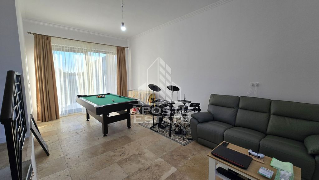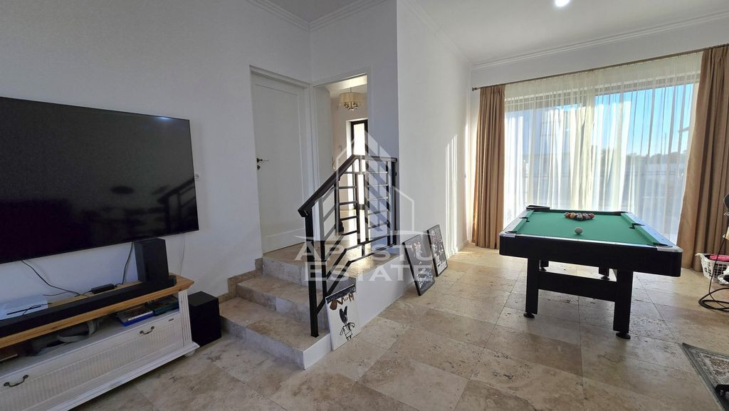 Apostu Estate ofera in exclusivitate spre vanzare o casa individuala remarcabila, situata in localitatea Sag, la doar 10 minute de Timisoara. Proprietatea a fost construita in anul 2019 si se remarca prin designul modern, spatiile generoase si atentia la detalii, fiind alegerea ideala pentru o familie care isi doreste confort si intimitate intr-o zona linistita, aproape de oras. Imobilul dispune de 5 camere, 3 bai, garaj incalzit si un foisor complet mobilat si utilat, perfect pentru petrecerea timpului in aer liber. Suprafata utila este de 210 mp, la care se adauga o terasa spatioasa de aproximativ 40 mp. Terenul aferent are o suprafata de aproximativ 1200 mp, oferind intimitate si spatiu verde amenajat cu gazon si sistem automat de irigatii. Casa este dispusa pe demisol, parter si etaj. La demisol se regasesc spatii de depozitare. Parterul cuprinde un hol de acces, camera tehnica, living open space cu bucataria, birou, baie cu fereastra si acces direct in garajul amenajat ca sala de jocuri. Etajul ofera 3 dormitoare, dintre care unul matrimonial cu dressing si baie proprie, precum si o baie secundara cu ventilatie naturala. Printre dotarile si finisajele premium se numara mobilierul realizat la comanda din lemn masiv de fag (Mobexpert), blat de granit in bucatarie, canapea din piele naturala, travertin, tamplarie PVC cu geam tripan Salamander, centrala proprie, incalzire in pardoseala Purmo, aparat de aer conditionat, sistem video de supraveghere 360, prize si intrerupatoare Schneider, poarta electrica cu interfon si deschidere automata. Proprietatea beneficiaza de panouri fotovoltaice care asigura independenta energetica, statie de incarcare electrica pentru masini, filtre de apa performante, sistem fluvial conectat la burlane, acoperis din tigla Creaton, zidarie din caramida Porotherm de 30 cm, izolatie exterioara cu polistiren de 12 cm si pod izolat. Foisorul este complet echipat cu plita si cuptor Bosch, gratar, loc de relaxare si zona de luat masa, fiind ideal pentru seri petrecute alaturi de familie si prieteni. Aceasta proprietate ofera tot confortul unei locuinte moderne, eficiente energetic, complet pregatita pentru a fi predata noului proprietar. Se accepta și schimb cu 2/3 apartamente in Giroc, plus diferenta dupa caz. Contacteaza-ne astazi pentru a programa o vizionare si a descoperi toate avantajele acestei case deosebite!