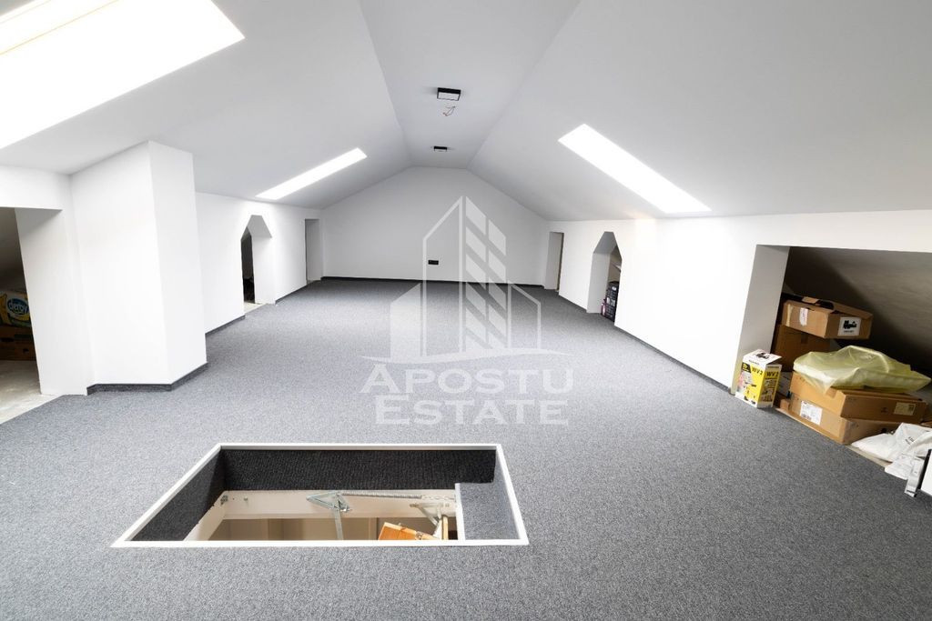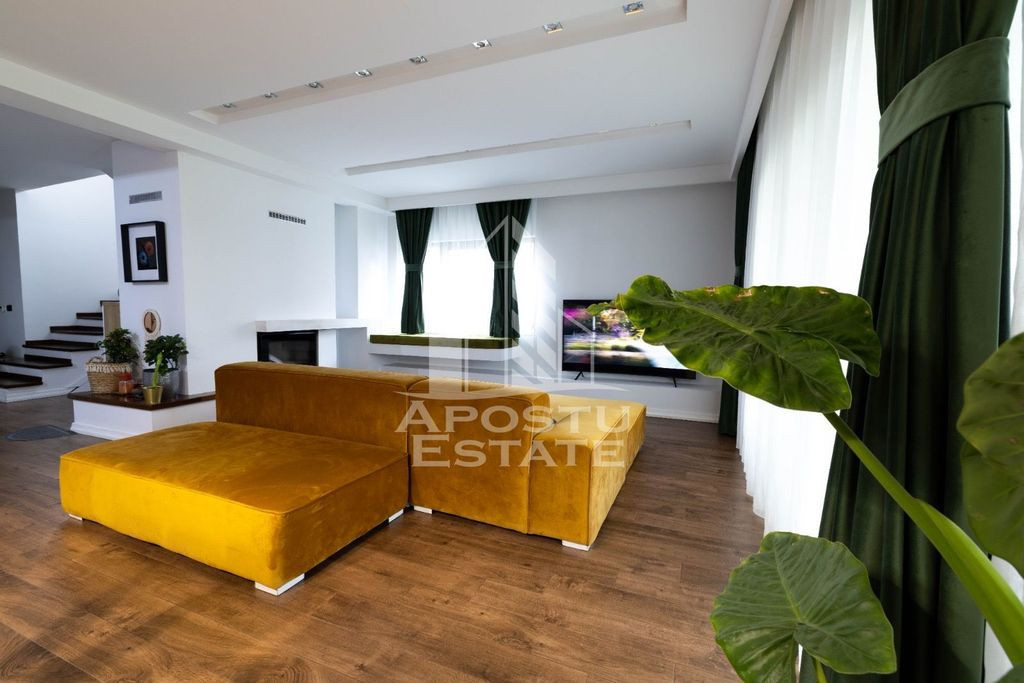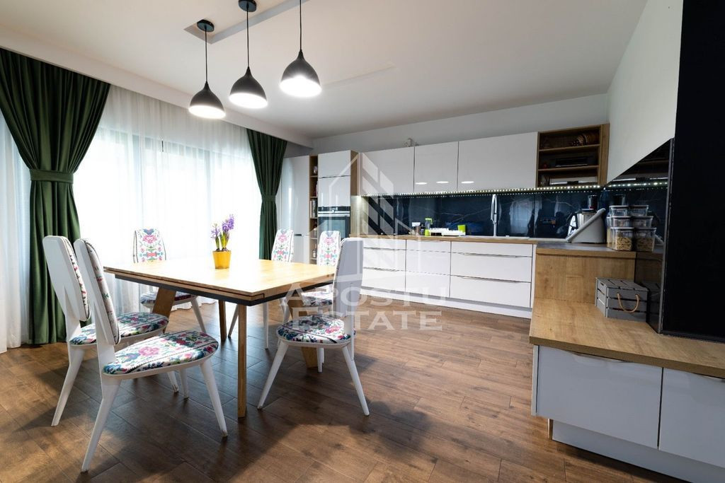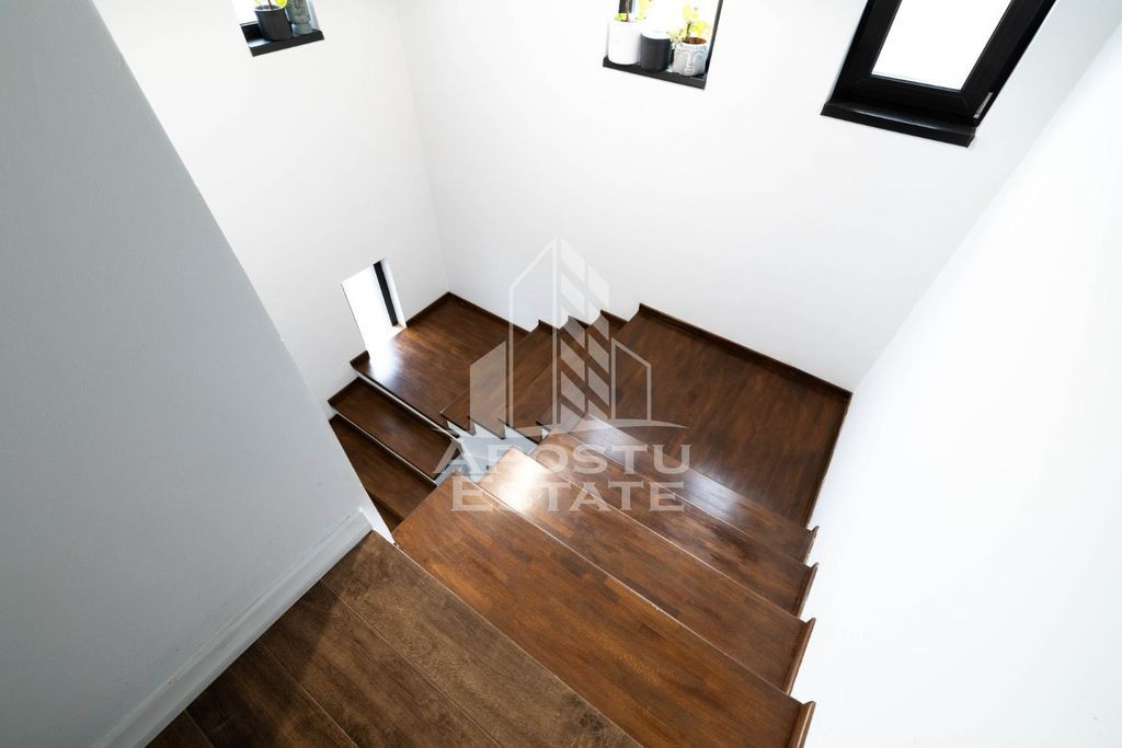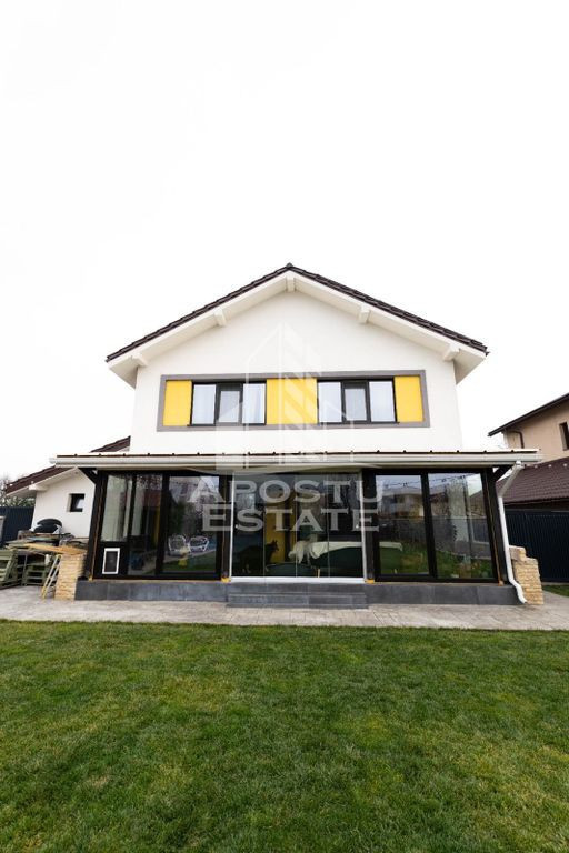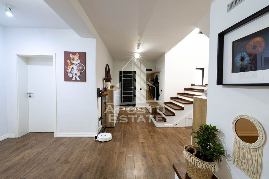 APOSTU ESTATE are placerea de a va propune spre vanzare o casa individuala cu 5 camere, regim de inaltime P+ 1E, localizata in Dumbravita. Proprietatea are o suprafata utila de 184 mp, cu o terasa inchisa de 22 mp, si este amplasata pe un teren de 879 mp. Compartimentare parter: - hol de acces, zona deschisa cu living open space si bucatarie, birou, baie, camera tehnica, garaj. Compartimentare etajul 1: - hol de acces, dormitor matrimonial, dressing, dormitor cu acces la banconul deschis si 2 bai. Casa dispune si de o mansarda amenajata de 81 mp utili care este dotata cu incalzire in pardoseala. In interiorul proprietatii amenajarile sunt armonios echilibrate, cu o atentie meticuloasa la detalii; sunt folosite materiale calitative, iar mobilierul este realizat la comanda. In exteriorul proprietatii regasim o oaza de liniste, un teren generos si atent creionat, cu o gradina amenajata pentru pomicultura ecologica, pomi fructiferi, plante decorative si o casuta din lemn pentru depozitarea sculelor. Sistemul de irigare se regaseste atat in gradina generoasa, cat si in fata casei. Sistemul de incalzire al casei este realizat prin intermediul centralei proprii pe gaz (incalzire in pardoseala) si a aparatului de aer conditionat. De asemenea, casa dispune si de panouri solare care au o capacitate de 10 kw/ora ceea ce iti ofera independenta energetica la toate electrocasnicele si aparatele electrice din casa, inclusiv la cuptorul si plita electrica. Casa este echipată cu un invertor hibrid, ceea ce va permite sa produceti energie solara si sa fiti prosumatori. Astfel, energia in exces produsa este injectata in retea, generand un venit constant an de an. Proprietatea se va vinde complet mobilata si utilata. Fiind amplasata intr-o zona linistita, dar si in continua dezvoltare, la asfalt si cu toate utilitatile necesare, proprietatea este una de exceptie si isi asteapta noul proprietar. Acceptam orice tip de credit bancar. Oferim consultanta si solutii financiare prin colaboratorii nostri. Va asteptam cu drag la o vizionare chiar astazi!