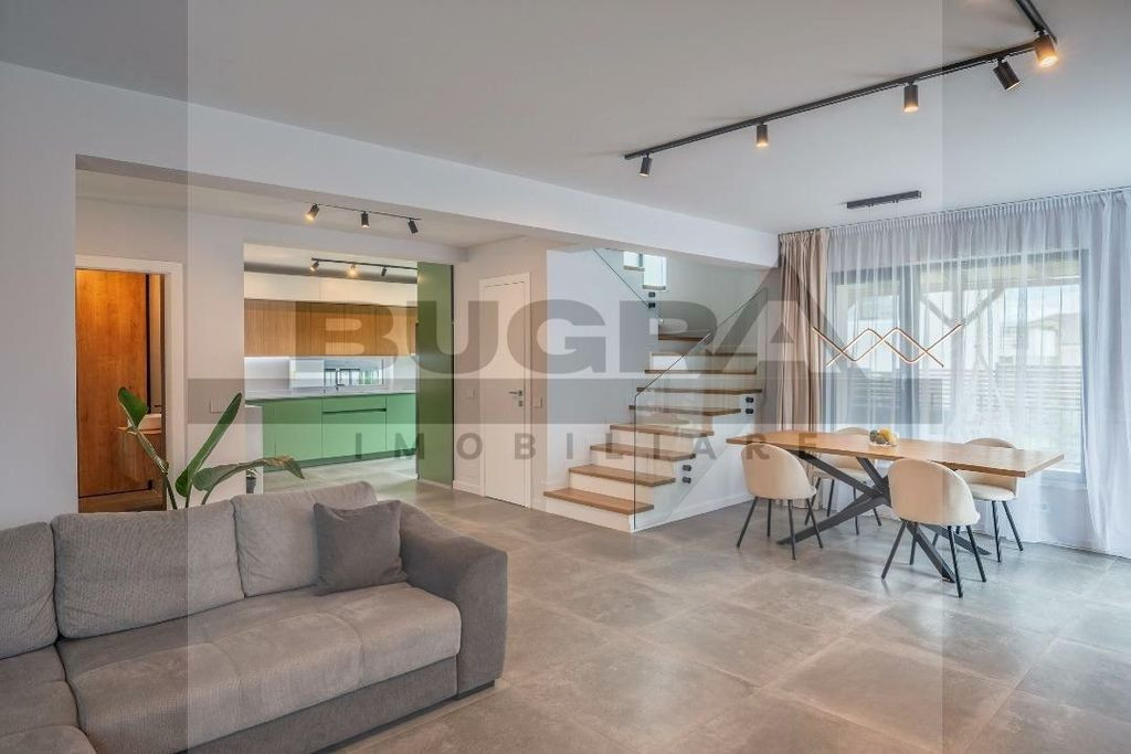 Situată într-o zonă liniștită, ferită de aglomerație, această proprietate este alegerea ideală pentru o familie care caută echilibru între funcționalitate, design și confort. Suprafață utilă: 127 mp Teren: 440 mp Finalizată în: 2021 Compartimentare și organizare: Parter: Living spațios cu zonă de dining Bucătărie complet utilată (mobilier la comandă, electrocasnice Bosch / Samsung / Electrolux) Baie cu mașină de spălat și uscător (Bosch / LG) Cameră de depozitare Hol generos Terasă de 24 mp Etaj: Dormitor matrimonial cu balcon și baie proprie Două dormitoare secundare Baie principală cu cadă, bideu și lavoar dublu Acces la pod – spațios și circulabil Dotări și finisaje premium: Încălzire în pardoseală pe ambele niveluri, control separat pe zone Centrală Viessmann cu boiler încorporat – confort termic constant Baterii Grohe / Hansgrohe, rezervoare Geberit Uși interioare din lemn masiv, cu balamale ascunse și izolare fonică Scări din lemn masiv, balustradă din sticlă Mobilier realizat cu designer de interior (se oferă schițele pentru amenajări viitoare) Bucătărie premium: Blat din quartz compozit Plită Bosch cu zone flexibile și funcție de gătit asistat Cuptor Bosch cu aburi și funcții inteligente Frigider Samsung side-by-side cu racord la apă și filtru Chiuvetă dublă Schock + baterie Grohe Exterior amenajat: Curte complet amenajată, cu sistem de irigație automatizat Gard viu (leylandii) și pomi fructiferi columnari plantați Zonă dedicată pentru legume, plante aromatice și jardinieră Terasă mobilată cu mobilier de exterior rezistent la intemperii Poartă cu sistem automatizat Fosă septică pentru colectarea apei pluviale (pregătită pentru montarea unei pompe de reutilizare) Bugra Imobiliare – partenerul tău de încredere pentru locuințe de calitate în Cluj și împrejurimi.