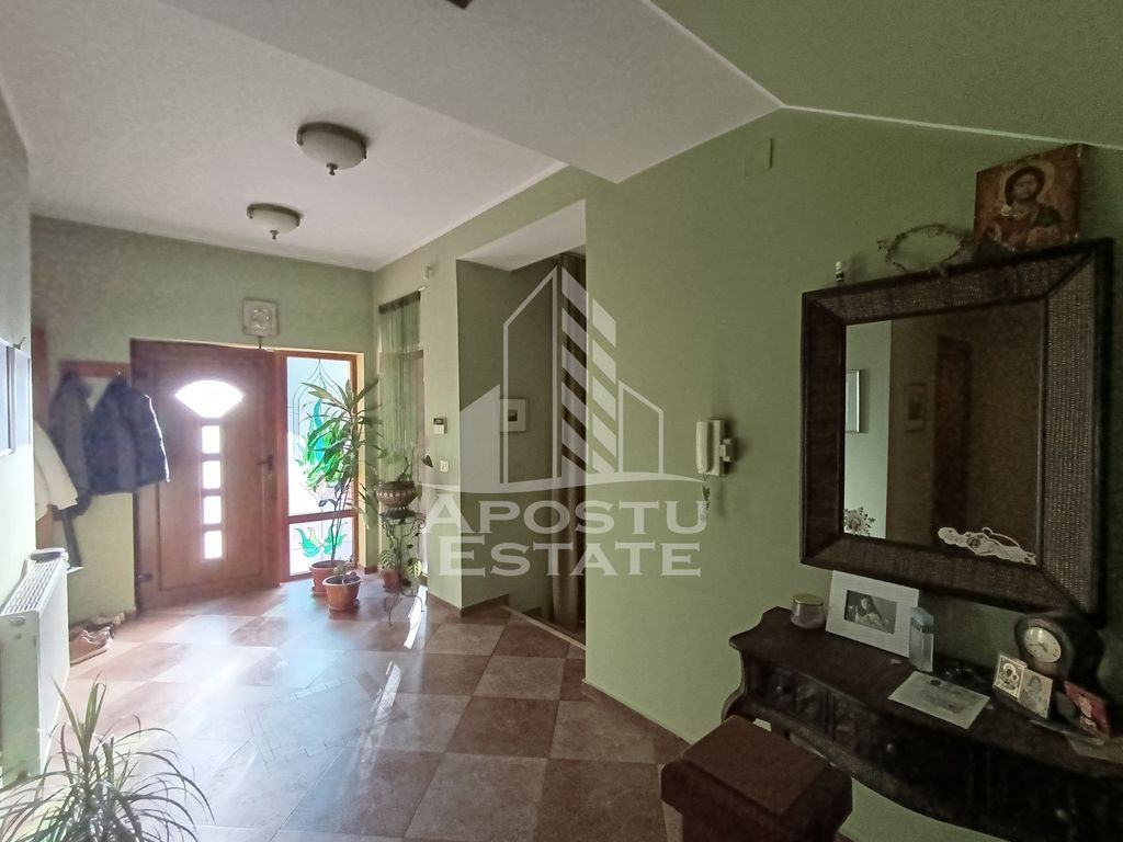APOSTU ESTATE va ofera spre vanzare o vila superba avand o curte generoasa cu pomi si spatii verzi. Descoperiți frumusețea unei vile deosebite, situată într-o zonă liniștită, ideală pentru familie! Detalii proprietate: Suprafață 709 mp teren, 195mpu, 500mp curte. -Curte generoasă, perfectă pentru petrecerea timpului în aer liber sau activitati cu familia. -Curte mare:500 mp Îngrijită cu pomi și spații verzi, ideală pentru relaxare sau activități în familie. -Garaj: Spațios, oferind doua locuri pentru mașină și depozitare suplimentară. PARTER: -Living spatios si luminos; -Bucatarie mobilata si utilata cu spatiu pentru dining cu iesire pe terasa; -Camera birou; -Baie dotata cu dus si geam pentru aerisire; -Camera tehnica. ETAJ: -Dormitor mobilat cu pat matrimonial si dressing propriu; -Dormitor matrimonial cu dresing propriu; -Dormitor/dresing/ camera birou ( poate fi amenajata dupa bunul plac); -Terasa incapatoare cu structura semirotunda cu vedere spre gradina; -Baie cu cada si geam pentru aerisire naturala; Va invitam cu drag sa programati o vizionare pentru a aprecia personal toate facilitatile si avantajele acestui imobil.