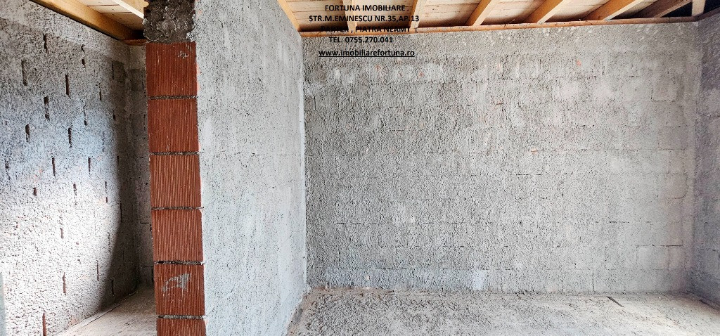 SUPER OFERTĂ! CASĂ INDIVIDUALĂ NOUĂ, INTIMĂ ȘI COCHETĂ, ÎN APROPIERE DE MUN. PIATRA NEAMȚ,CU TOATE UTILITĂȚILE, DE LA 80.000 EURO +TVA. Căutați să vă detașați de mediul urban, dar să beneficiați de condițiile de la oraș într-un spațiu intim, unic, plin de personalitate și caracter, ce îmbină stilul rustic cu cel modern, atunci FORTUNA IMOBILIARE vă aduce în atenție această proprietate individuală, compusă din casă parter și 500 mp teren, situată în Dumbrava Roșie, la circa 9 Km/10 minute de Mun. Piatra Neamț,într-o zonă liniștită, în plin avânt imobiliar. Locuința cu o suprafață construită de 130 mp, suprafața utilă de 98 mp se află în etapa de finalizare a proiectului - grad uzură zero. Este edificată pe fundație solidă din beton armat, zidărie din cărămidă de 30 cm la pereții exteriori și 25 cm la pereții interiori, acoperită cu tablă profilată tip Lindab, fiind prevăzută cu încălzire în pardoseală, termopane cu 3 sticle și 7 camere, termosistem exterior de 10 cm, izolație pod cu vată bazaltică de 15 cm + folie anticondens. Este compartimentată astfel: 1 living spațios, bucătărie (cu ieșire în terasă), 2 dormitoare generoase, 2 băi cu aerisire naturală și camera centralei / debara. Terenul cu o deschidere la stradă de 16 ml este împrejmuit în integralitate cu gard solid cu fundație, elevație și stâlpi din beton armat și porți metalice. Curtea urmează să fie amenajată modern, cu alei betonate bine organizate. Veți beneficia de suficient spațiu pentru a crea o atmosferă de relaxare în aer liber, ideal pentru iubitorii de grătare în familie sau petreceri în aer liber. Copiii se pot juca în voie, fără grija traficului de mașini, iar pasionații de grădinărit pot amenaja un spațiu verde pentru plante și flori. Astfel, această casă reprezintă o oază de liniște și confort, atât în interior, cât și în exterior, unde vă puteți bucura de intimitate, aer curat și de frumusețea naturii. Proprietatea poate fi achiziționată cu finisajele exterioare executate si interiorul la roșu pentru suma de 80.000 EURO+ TVA, sau finalizată integral pentru suma de 110.000 EURO + TVA Pentru o prezentare detaliată a acestei oferte, furnizarea unor informații suplimentare referitoare la situația juridică / identificarea imobilului și programarea unei vizionări, vă invităm la sediul nostru, Fortuna Imobiliare, situat pe str. M. Eminescu, nr. 35, ap. 13, parter, lângă fostul Tribunal, tel. contact 0755.270.041. Your comfort is our priority ! Oferta noastră completă o găsiți aici: https://imobiliarefortuna.ro/