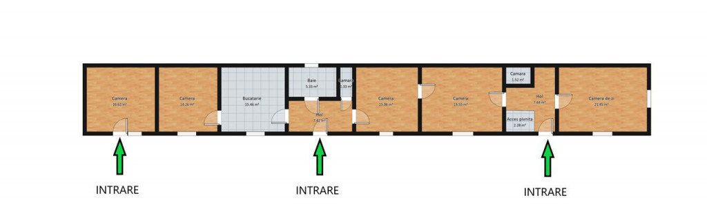 De vanzare in zona Turnisor din Sibiu, casa individuala construita doar pe parter, compusa din 5 camere si 127 mp locuibili, doua pivnite si o anexa si teren in suprafata de 800 mp. Amprenta la sol a imobilului si a anexei este de 252 mp, suprafata terenului liber care are deschiderea la strada de 8 m este de 1080 mp care permite accesul auto in curte, acesta fiind cumpusa din curte din fata care este placata uniform cu placi din beton si gradina din spate utilizata gradinaritului si care este amenajata si cu zona verde cu pomi fructiferi, zona de gratar care sunt despartite de o anexa gospodareasca de aproximativ 100 mp. Suprafata locuibila de 127 mp utili este distribuita pe un singur niver, locuinta beneficiaza de 2 cai de acces in incinta si este compusa din camera de zi 21.50 mp, 3 dormitoare de 19.43 mp, 15.00 mp si respectiv 14.32 mp, bucataria inchisa de 15.50 mp, 2 holuri de 10.00 mp si respectiv 7.77 mp, baia de 5.30 mp dotata cu geam de aerisire si cabina de dus, 2 camari de 1.50 mp fiecare si o camera de 16.60 mp. Separat de suprafata utila a casei se afla si o sura de aproximativ 100 mp construita pe fundatie din beton si pe toata latimea curtii care este bransata la curent trifazic. Cele 2 pivnite au suprafete de 19.02 mp destinata depozitarii si a doua de 17.22 care in prezent deserveste ca si bucatarie de vara, aceasta beneficiind de toate dotariile, acestea sunt despartite de un hol de aproximativ 6.00 mp. Podul este in suprafata egala cu suprafata utila a casei, acesta fiind utilizat ca si spatiu de depozitare. Din punct de vedere structural casa este edificata pe fundatie din beton cu zidarie din caramida iar la exterior este izolata termic cu polistiren expandat si acoperit cu decorativa. Acoperisul este tip sarpanta cu invelitoare din tigla. Casa detine dotari si finisaje precum: centrala proprie pe gaz cu calorifere din otel, tamplarie PVC cu geam termopan, instalatie termic si electrica din cupru, usi de acces din PVC, pardoseala camerelor este placata cu parchet iar in bucatarie si baie cu gresie, peretii baii placati cu faianta, usi interioare din lemn. Valoarea de achizitie a casei este de 220.000 euro negociabil, aceasta se poate achizitiona si prin accesarea unui credit bancar. ID intern: 2580.