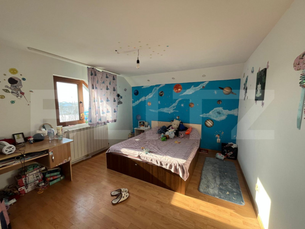 Blitz va propune spre vanzare casa cu 5 camere in Miroslava • Suprafață teren: 983 mp, împrejmuit cu gard. • Suprafață construită la sol: 128 mp. • Regim de înălțime: parter + mansardă, plus subsol parțial (beci). • An construcție: 2007, intabulare actualizată 2024. • Structură: cărămidă, acoperiș tip șarpantă cu învelitoare tablă. • Utilități: gaz, curent, apă, fosă septică (conectare la rețea stradală în zonă). Compartimentare parter • Living spațios, cu zonă de relaxare. • Bucătărie mare, separată, cu spațiu de luat masa. • Baie cu duș și zonă pentru mașină de spălat. • Hol generos și casă a scării. • Garaj încorporat, cu ușă automatizată (de finisat la exterior). Compartimentare mansardă • 4 dormitoare luminoase, fiecare cu fereastră mare și calorifere. • Hol central cu acces către toate camerele. • Baie la etaj. • Balcon cu vedere spre curte. Curte și exterior • Curte mare, predominant în spate, cu pomi fructiferi. • Zonă amenajată pentru grătar, foișor/masă exterioară. • Spațiu generos pentru loc de joacă copii sau viitor foișor/piscină. • Loc de parcare suplimentar în fața casei. • Interior locuibil, dar necesită reîmprospătare/modernizare (mobilier, uși interioare, fațadă exterioară nefinalizată). • Ideală pentru familie cu copii, într-o zonă liniștită de case, cu acces bun către Iași (Miroslava). Cod ofertă / ID BLITZ: P162100 Id intern: P162100