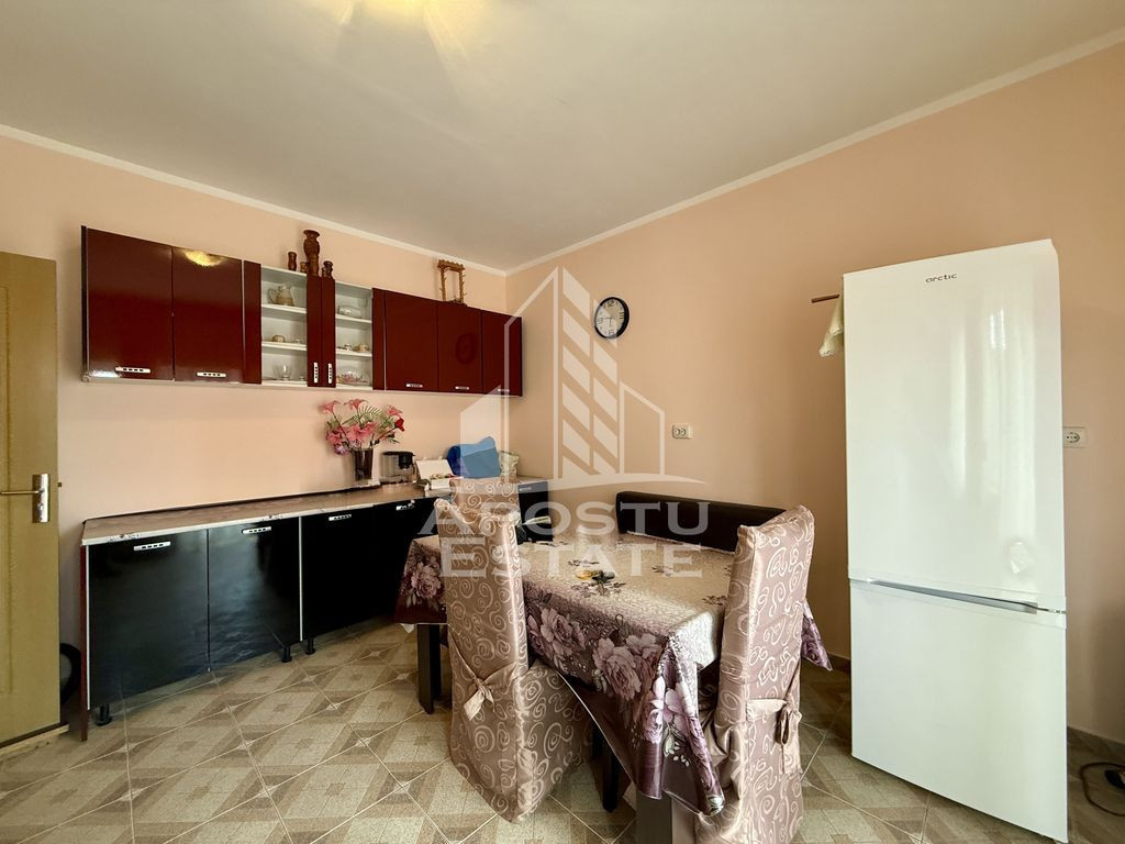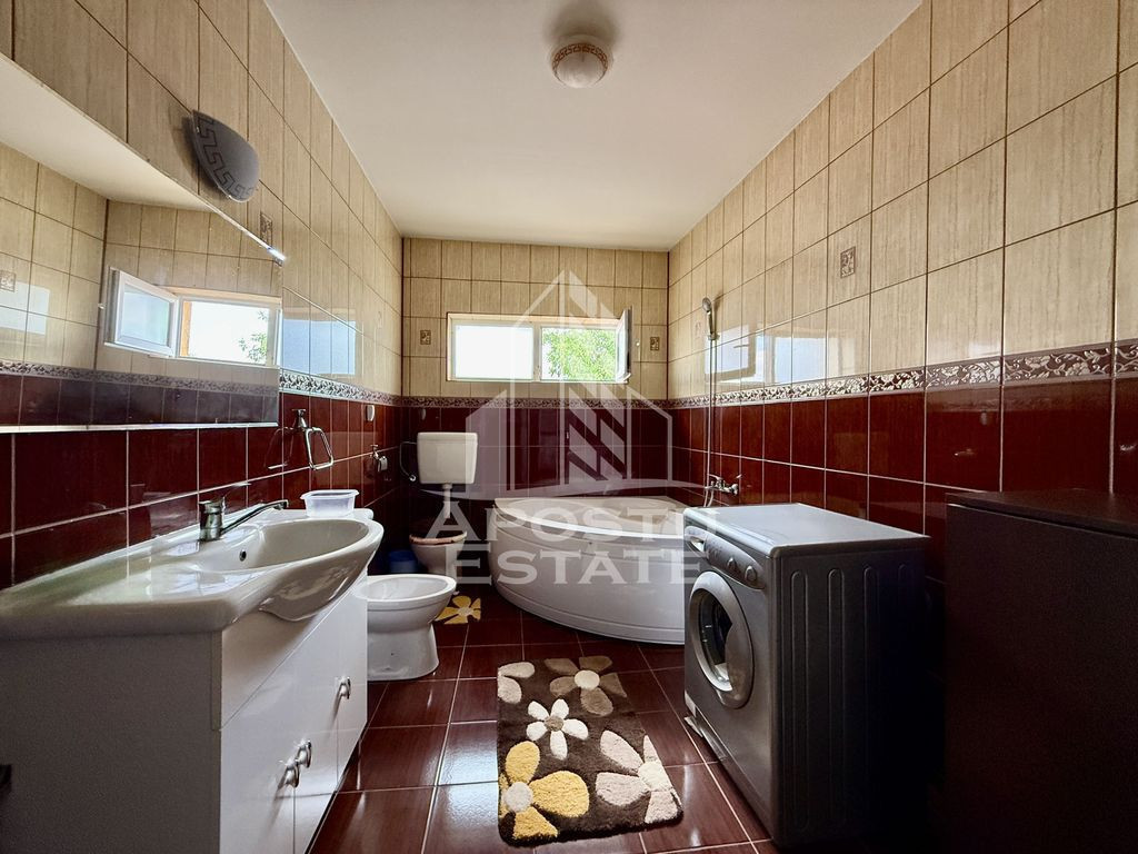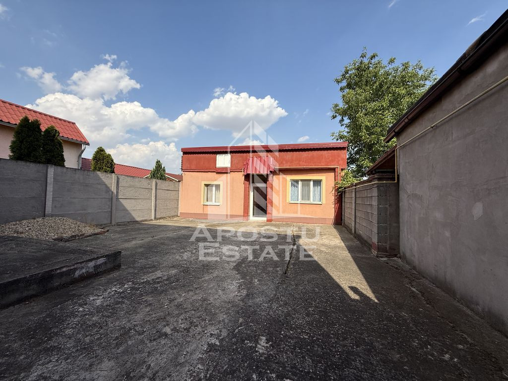 APOSTU ESTATE va propune spre vanzare o proprietate situata in zona Ghirodei din Timisoara, intr-o zona linistita si in plina dezvoltare rezidentiala. Proprietatea se afla pe un teren generos de 716 mp, cu front stradal de 19 ml si este compusa din doua constructii functionale si bine compartimentate. Constructie solida din caramida Porotherm de 30 cm, finalizata in anul 2013, cu fundatie de 1,5 m adancime si doua randuri de fier. Izolata exterior cu polistiren de 10 cm, ferestre PVC cu geamuri termopan. Regim de inaltime: parter + etaj + pod cu posibilitate de mansardare. Compartimentare: -Parter: living, bucatarie, wc de serviciu -Etaj: 3 dormitoare si baie -Suprafata utila: 116 mp Casa secundara (intabulata ca anexa): Compusa din 2 camere, bucatarie, baie si terasa, cu o suprafata de aproximativ 70 mp. Ideala pentru o familie extinsa, birou, atelier sau inchiriere. Alte dotari si beneficii: -Garaj inchis si acoperit -Proiect de gaz realizat (5 focuri) -Instalatie de incalzire montata, lipseste doar centrala proprie -Proprietatea se vinde mobilata si utilata, exact ca in imagini -Put de apa forat la 40m Locuinta ideala pentru o familie care doreste spatiu, confort si posibilitati multiple de folosinta, intr-o zona in continua dezvoltare. Acces facil catre oras, cu infrastructura buna si vecinatati civilizate. Pentru informatii suplimentare sau programarea unei vizionari, va rugam sa ne contactati.
