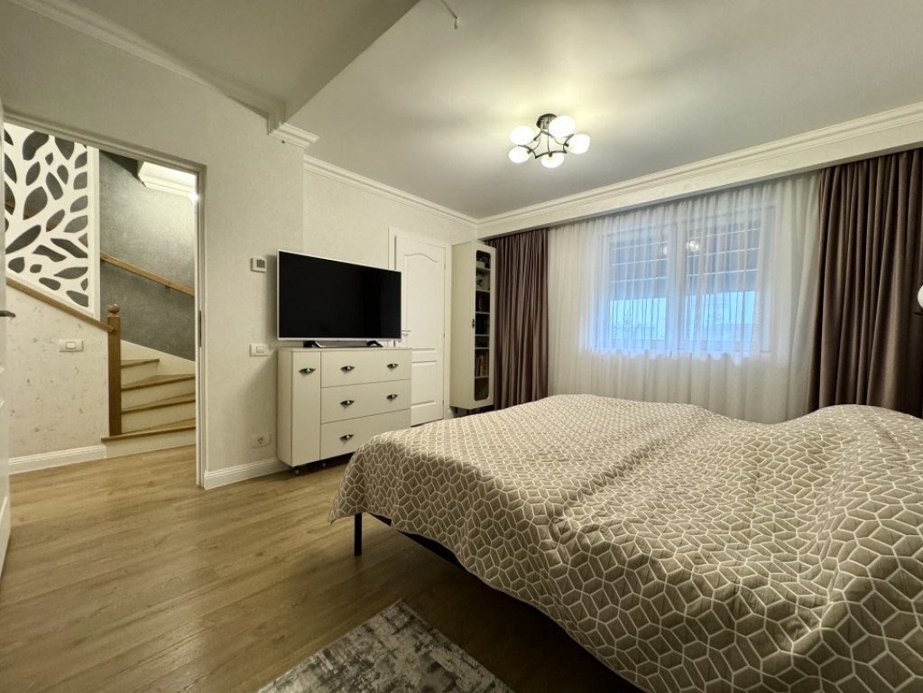 Casă înșiruită de colț, premium, ideală pentru familie, situată într-o zonă foarte bună din Pipera – Voluntari. Construită solid în 2017 și renovată complet în 2025, locuința oferă confort, eficiență și un nivel de dotări rar întâlnit. Caracteristici principale: • 145 mp utili, P + 1 + mansardă; • 5 camere | 4 băi (3 cu fereastră); • Grădină privată: 70 mp în spate + 30 mp lateral, cu plante mature; • 2 locuri de parcare; • Terasă acoperită + grătar profesional. Confort şi eficiență: • Încălzire în pardoseală cu automatizare pe fiecare cameră; • Centrală Viessmann cu boiler incorporat; • Aer condiționat LG Dual Inverter în toate dormitoarele; • Dedurizator apă, filtre aer, dezumidificare băi; • Sistem de irigaţie; • Grătar profesional din cărămidă, cu inox alimentar (investiţie 11000E); • Acoperi; Wetterbest cu izolaţie performantă; • Instalaţie electrică cu protecţie plus rezervă; • Pregătire pentru camere video, alarmă şi incendiu; • Dezumidificatoare şi filtre de aer pe fiecare nivel. Calitate şi siguranță: • Construcție din beton armat, izolație superioară; • Tâmplărie Rehau, folii antiefracție şi protecție solară; • Instalații electrice moderne, protecții la fluctuații; • Smart-ready: iluminat, marchize, copertine Somfy; • Panou trifazat pentru stație de încărcare auto electrică. Casa este complet echipată, atent întreținută și pregătită pentru mutare imediată, fără investiții suplimentare. Un cămin cald, sigur și elegant, pentru o familie care își dorește mai mult decât „o simplă casă”. Id intern: P238660