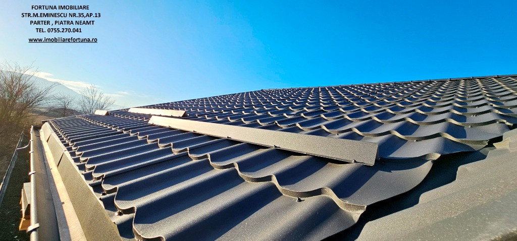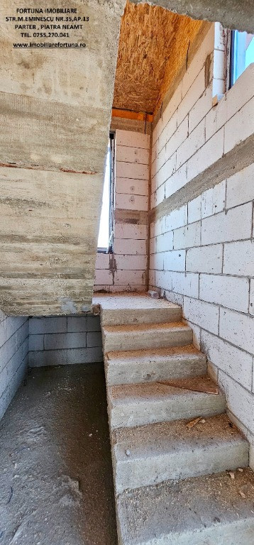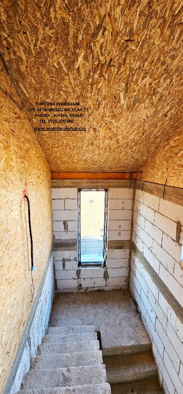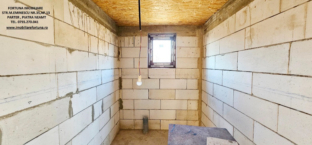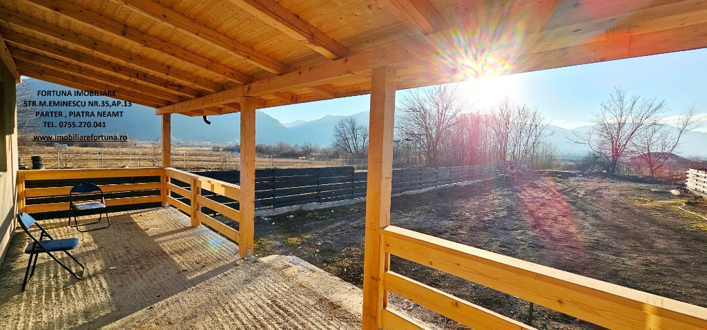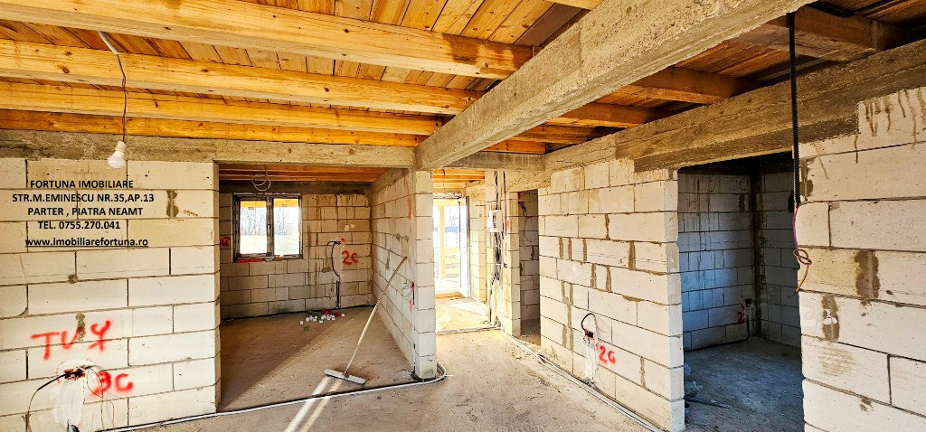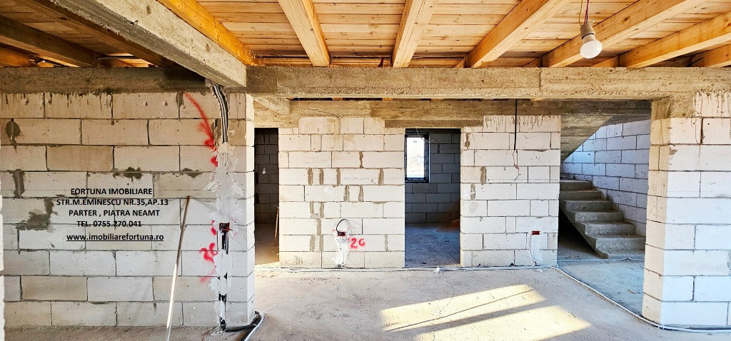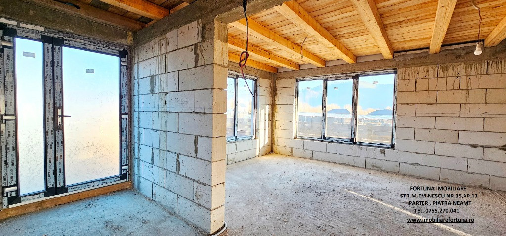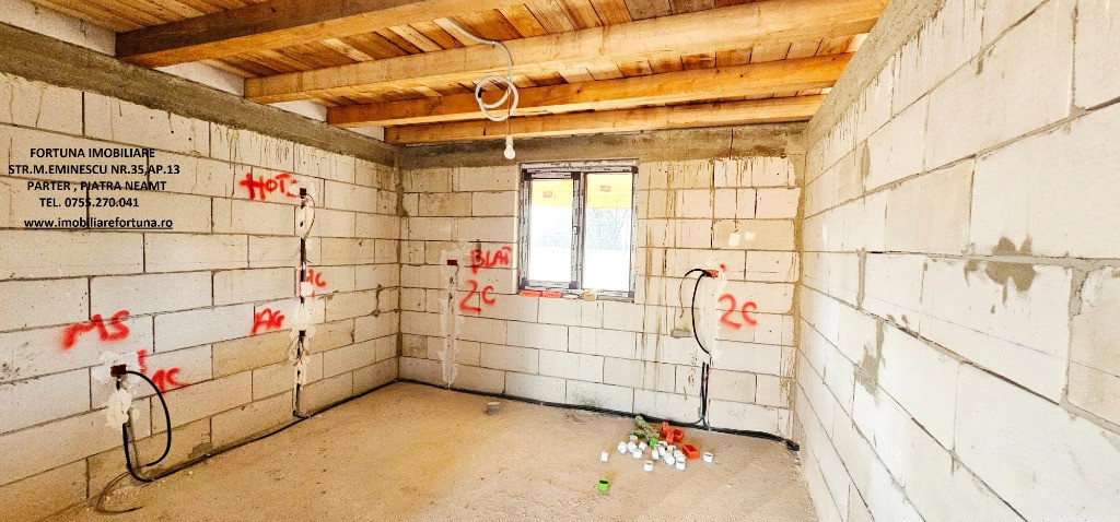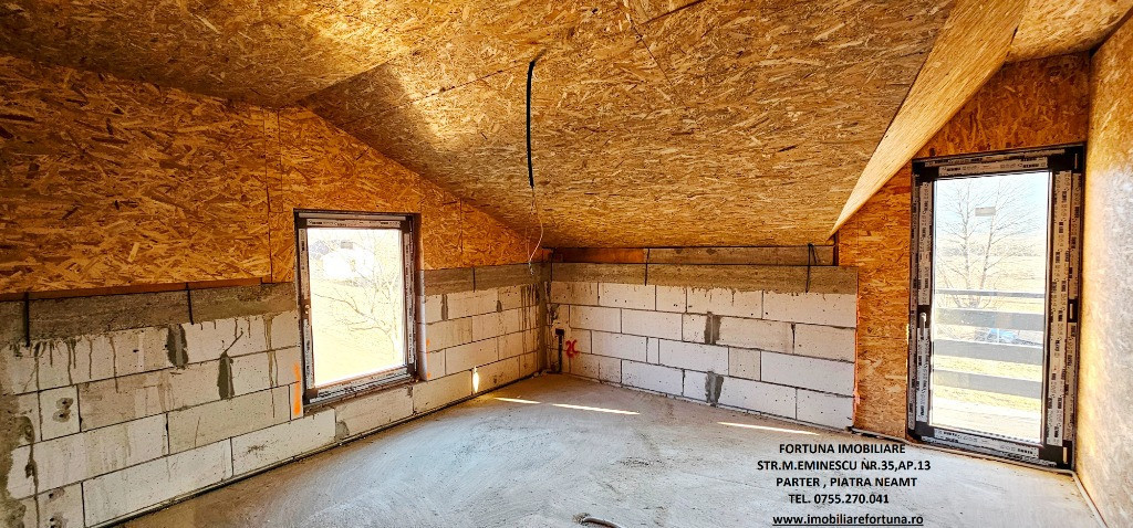 CASĂ LA GRI P+M ȘI 1200 MP TEREN, LA 5 MIN DE ORAS, 150.000 EURO Oferim spre achizitionare un imobil compus din suprafața de 1.200 mp teren, pe care este edificată o casă, cu regim de înălțime P+M, cu suprafața construita la sol de 100 mp, suprafața utilă desfășurată de 180 mp, construită în anul 2024, pe fundații din beton armat, zidărie din BCA, acoperita cu tablă profilata tip Lindab, prevăzută cu termopane și termosistem exterior de 10 cm, situată în com. Alexandru cel Bun, Sat Bistrița, jud. Neamț, la 5 minute de oraș, în zonă verde, liniște și aer curat. Casa este compartimentata astfel: Parter : terasa mare acoperita, hol, baie, bucatarie, living, dormitor. Mansardă : hol cu ieșire în terasă, baie, 3 dormitoare, 2 balcoane. Beneficiază de instalațiile electrică și sanitară, este conectată la apă și curent electric de la rețeaua publică, iar gazul trece prin fata porții. Proprietatea deține un beci generos precum și un foișor din lemn, rustic. Terenul, plan, este împrejmuit cu gard și porți din fier forjat. Preț 150.000 euro Pentru o prezentare detaliată a acestei oferte, furnizarea unor informații suplimentare referitoare la situația juridică / identificarea imobilului și programarea unei vizionări, vă invităm la sediul nostru, Fortuna Imobiliare, situat pe str. M. Eminescu, nr. 35, ap. 13, parter, lângă fostul Tribunal, tel. contact 0755.270.041. Your comfort is our priority ! Oferta noastră completă o găsiți aici: https://imobiliarefortuna.ro/