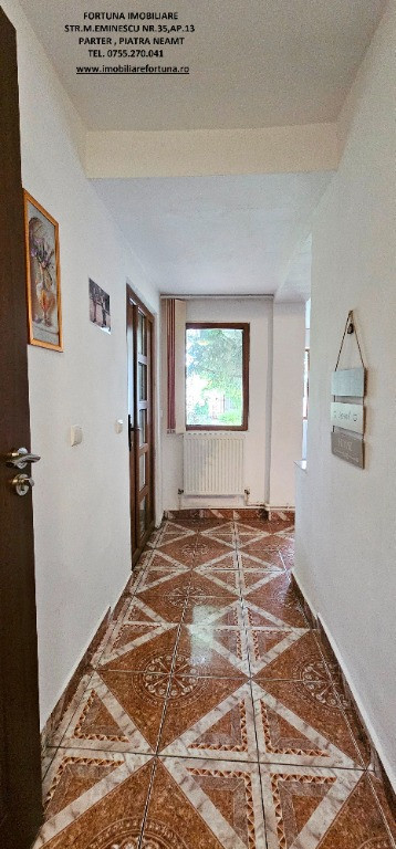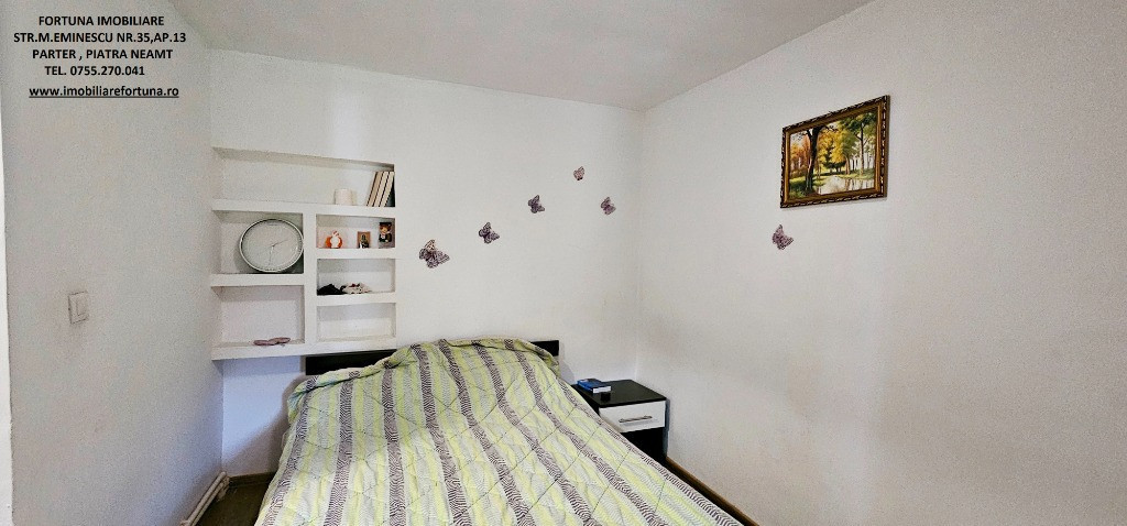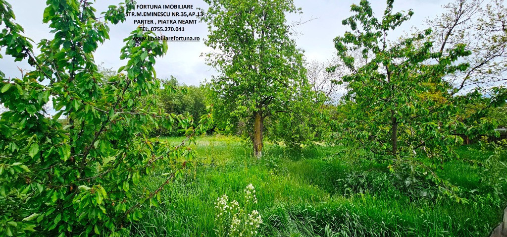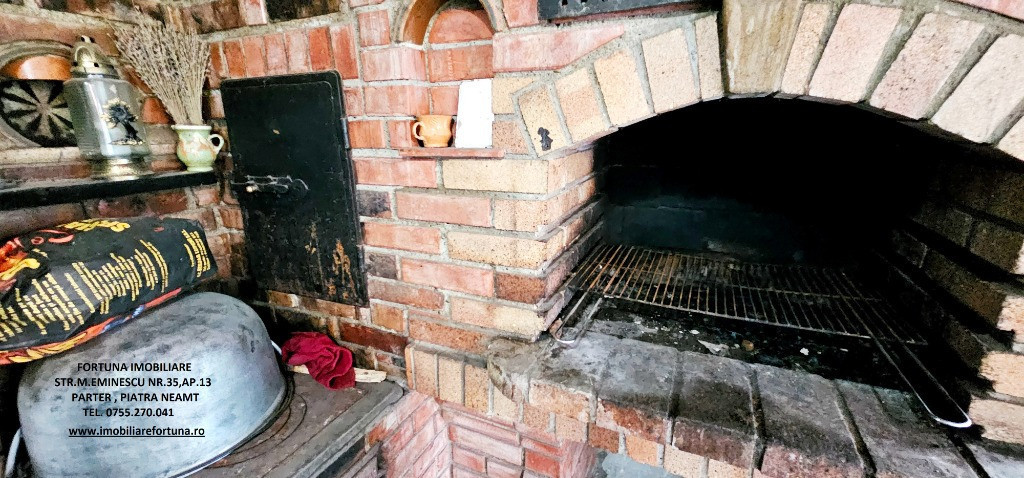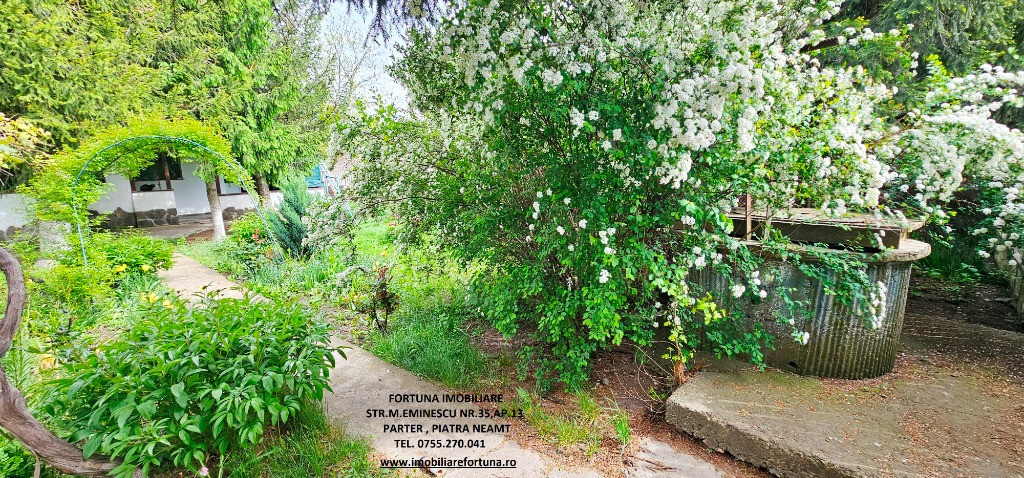 CASĂ LA PREȚ DE APARTAMENT, CU MUTIPLE FACILITĂȚI ȘI 2.358 MP TEREN, LA 10 MIN DE ORAS, 75.000 EURO Oferim spre vânzare un imobil compus din suprafața de 2.358 mp teren, pe care este edificată o casă, cu suprafața de 79 mp, construită în perioada 1965 – 1970 ( renovată recent ), pe fundații din beton armat, zidărie din cărămidă, acoperita cu tablă, prevăzută cu termopane și termosistem exterior de 10 cm, situată în com. Girov, la 10 minute de oraș, în zonă verde, liniște și aer curat. Casa este compusă din : hol, baie, living cu bucătărie - open space, 2 dormitoare, cameră tehnică și o terasă mare acoperită, prevăzută cu grup barbeque rustic din cărămidă - grătar, plită, afumătoare. Casa este conectată la rețeaua publică de apă (dar există și sursă proprie de apă) și de electricitate, iar încălzirea se face prin intermediul unei centrale termice cu lemne, cu instalație termică pe calorifere. Terenul, cu front stradal de 30 ml, împrejmuit cu gard din fier forjat, este frumos amenajat cu alei betonate, gazon, flori, tuia, viță de vie, pomi pe rod. Proprietatea se află între case, la drum asfaltat, având acces facil la mijloace de transport în comun. Preț 75.000 euro Pentru o prezentare detaliată a acestei oferte, furnizarea unor informații suplimentare referitoare la situația juridică / identificarea imobilului și programarea unei vizionări, vă invităm la sediul nostru, Fortuna Imobiliare, situat pe str. M. Eminescu, nr. 35, ap. 13, parter, lângă fostul Tribunal, tel. contact 0755.270.041. Your comfort is our priority ! Oferta noastră completă o găsiți aici: https://imobiliarefortuna.ro/