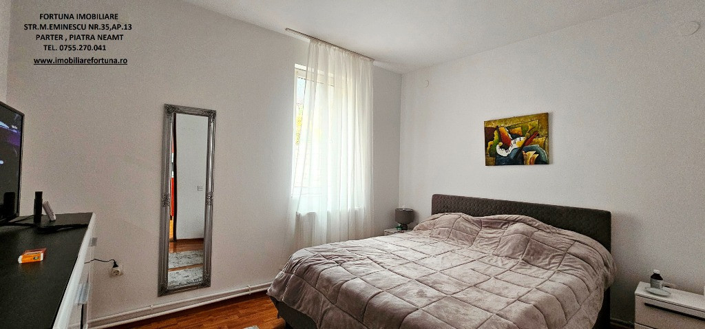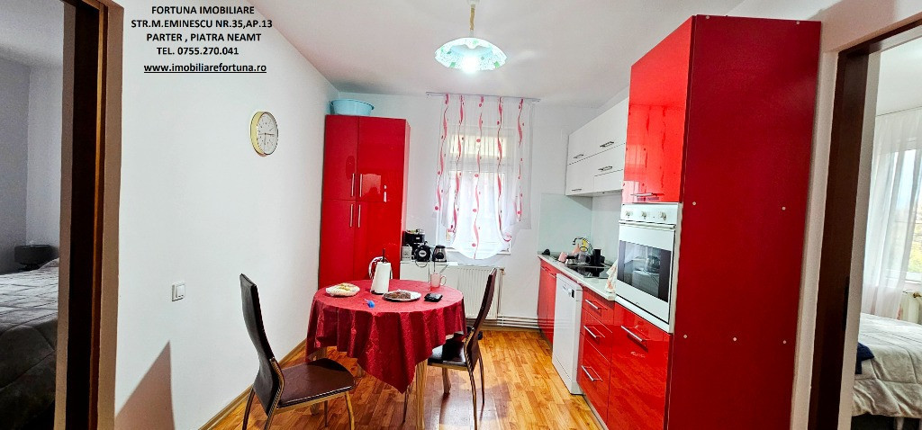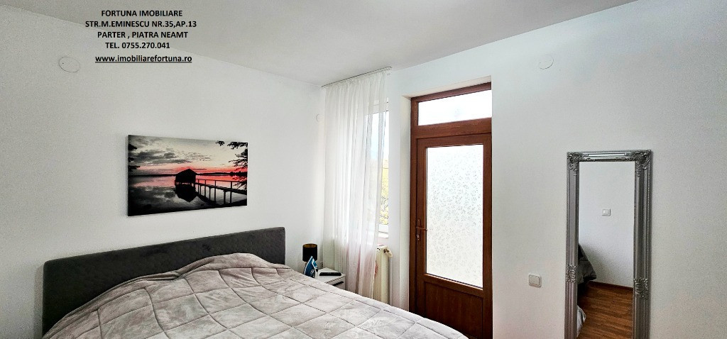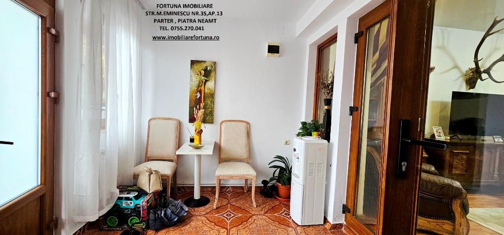 CASĂ MOBILATĂ ȘI UTILATĂ INTEGRAL, CU TERASĂ, ZONA VERDE, PIATRA NEAMȚ, 85.000 EURO Oferim spre achiziționare o casă cu suprafața de 98 mp, construită din cărămidă, acoperită cu tablă profilată tip Lindab, compusă din hol, cameră de zi cu șemineu funcțional, 2 dormitoare, dressing, baie și bucătărie cu ieșire în terasă exterioară. Deține in proprietate exclusivă doar terenul de sub casă. Imobilul este prevăzut cu termosistem exterior, ușă antiefracție la intrare, centrală termică, termopane, parchet, gresie, faianță. Este foarte curat si îngrijit, fiind amenajat cu materiale de calitate și aplecare către eleganță, bun gust si confort. Proprietatea se află între case, la drum asfaltat, este conectată la rețeaua publică de electricitate, apă, gaz metan și canalizare. Are acces foarte facil la mijloace de transport în comun precum și la toate obiectivele de interes urban : școli, licee, grădinițe, magazine, unități medicale. Se vinde mobilata și utilată cu tot necesarul pentru un trai confortabil, așa cum este prezentată în fotografii. Preț 85.000 euro Pentru o prezentare detaliată a acestei oferte, furnizarea unor informații suplimentare referitoare la situația juridică / identificarea imobilului și programarea unei vizionări, vă invităm la sediul nostru, Fortuna Imobiliare, situat pe str. M. Eminescu, nr. 35, ap. 13, parter, lângă fostul Tribunal, tel. contact 0755.270.041. Your comfort is our priority ! Oferta noastră completă o găsiți aici: https://imobiliarefortuna.ro/