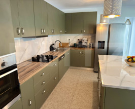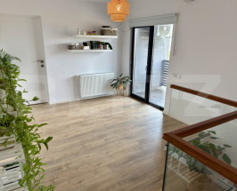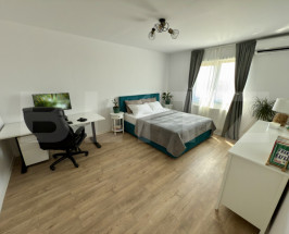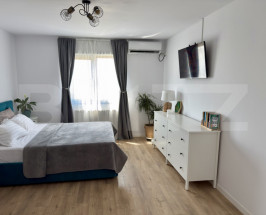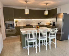 Bucătărie: Modernă, realizată la comandă, cu insulă și sistem soft-close, complet utilată cu cuptor electric, hotă, mașină de spălat vase și chiuvetă cu tocător.