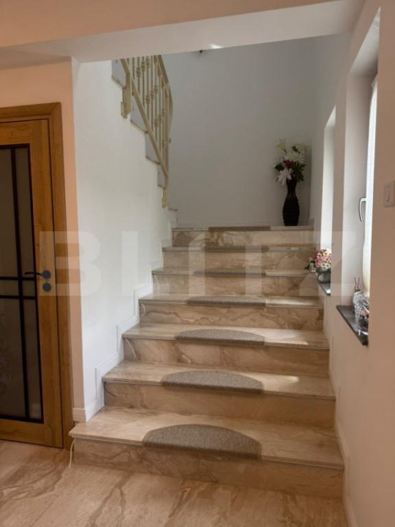 Blitz va propune spre vanzare o casa moderna cu regim de inaltime P+1E+pod, construita in 2004 cu doua randuri de caramida porotherm. Suprafata de teren este de 10 ari (1000 de metri patrati). Casa are 193 mp utili si este complet renovata la interior , totul nou , calitate superioara :tencuieli, termopane 7 camere /3 sticle, usi, exterioare si interioare, instalatii sanitare noi, bai, parchet lemn masiv triplustratificat, granit, instalatii, centrala gaz, calorifere. Mobila este facuta pe comanda noua din lemn masiv si MDF. Supraveghere video, gard de piatra si fier. Este izolata exteior. Dispune de 4 dormitoare, 2 bai, 1 living, 1 bucatarie cu mobila si electrocasnice noi 3 balcoane 1 beci sub casa. Incalzire cu centrala pe gaz dar dispune si de o centrala pe lemne care este aparte de casa. Garaj foarte spatios avand sub el beci zidid de piatra. Foisor mare inconjurat cu vie. Canalizare retea publica. Apa: Fantana proprie. Livada pomi fructiferi. Magazii, padoc pentru caine. Casa se poate preda mobilata sau nemobilata. Pe suprafata terenului liber se mai poate construi inca o casa , suprafata libera de teren fiind o parcela de aproximativ 6 ari. Pentru mai multe detalii nu ezitati sa ne contactati! Cod ofertă / ID BLITZ: P147575 Id intern: P147575