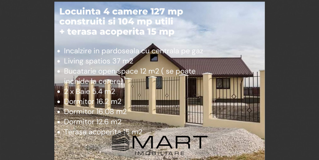 Descoperă liniștea și confortul unei locuințe moderne, aflate la doar 8 km de Brașov, într-un cartier nou, în curs de dezvoltare. Casa este amplasată pe un teren generos de 500 m², are o suprafață construită de 127 m² și o suprafață utilă de 104 m². Construită din cărămidă Porotherm Wienerberger cu cadre de beton, locuința este orientată și vitrată pentru a beneficia din plin de lumina naturală. Accesul se face pe un drum pietruit de aproximativ 150 m de la asfalt, într-o zonă cu case locuite și vecini stabili. Localizare și distanțe utile: 700 m până la stația de autobuz, 2.6 km până la Lidl, 8 km până în Brașov, 11 km până în Centrul Civic al Brașovului. Compartimentare: Living spațios – 37 m² Bucătărie open space – 12 m² (se poate închide la cerere) 2 băi – 5.4 m² fiecare. 2x Dormitoare principale – 16.2 m² si 16.8 m², Dormitor secundar – 12.6 m², Terasa acoperita 15 m² . Finisaje și dotări incluse: Casa se predă la cheie, în termen de 12 luni, cu toate finisajele interioare și exterioare incluse. Gresie, faianță, parchet și uși interioare la alegerea clientului, în limita bugetului stabilit. Tâmplărie PVC Salamander, 5 camere, cu 3 foi de sticlă. Încălzire în pardoseală în baie sau opțional în toată casa. Pod cu scară retractabilă, 2.1 m înălțime pe coamă, pe toată suprafața casei Gard cu stâlpi de beton în partea din față și lateral cu stâlpi metalici și panouri de lemn Utilități: gaz, apă, canalizare, curent electric și fibră optică. Alte informații utile: Există mai multe variante de proiect, adaptate nevoilor clientului. Se pot viziona proiecte finalizate și predate, dar și proiecte în curs de execuție. Plata se face în tranșe pe perioada construcției, după achitarea unui avans de 30%. O casă luminoasă, solid construită și perfect echilibrată între confort modern, natură și acces facil către Brașov. Ideală pentru familiile care își doresc liniște, siguranță și un cămin pe termen lung. Hărman este o localitate apreciată pentru siguranță, liniște și comunitatea bine închegată. Amplasarea sa la câteva minute de Brașov o face ideală pentru familii și pentru cei care vor un echilibru între natură și acces rapid către oraș. Cu infrastructură în continuă modernizare, servicii locale bune, grădinițe, școli și supermarketuri aproape, Hărman oferă un ritm de viață confortabil și aerisit. Proximitatea față de zone verzi, trasee, terenuri agricole și puncte istorice conferă localității un farmec autentic și un potențial excelent de dezvoltare rezidențială pe termen lung. Prețul de promovare este de 144.600€ + TVA /negociabil în funcție de condițiile stabilite împreună cu proprietarul. Pentru mai multe detalii despre această proprietate și pentru programarea unei vizionări, vă rugăm să contactați consultantul responsabil. Smart Imobiliare vă oferă consultanță completă pe tot parcursul tranzacției, de la prima vizită și până la predarea cheilor. Id intern: P18283