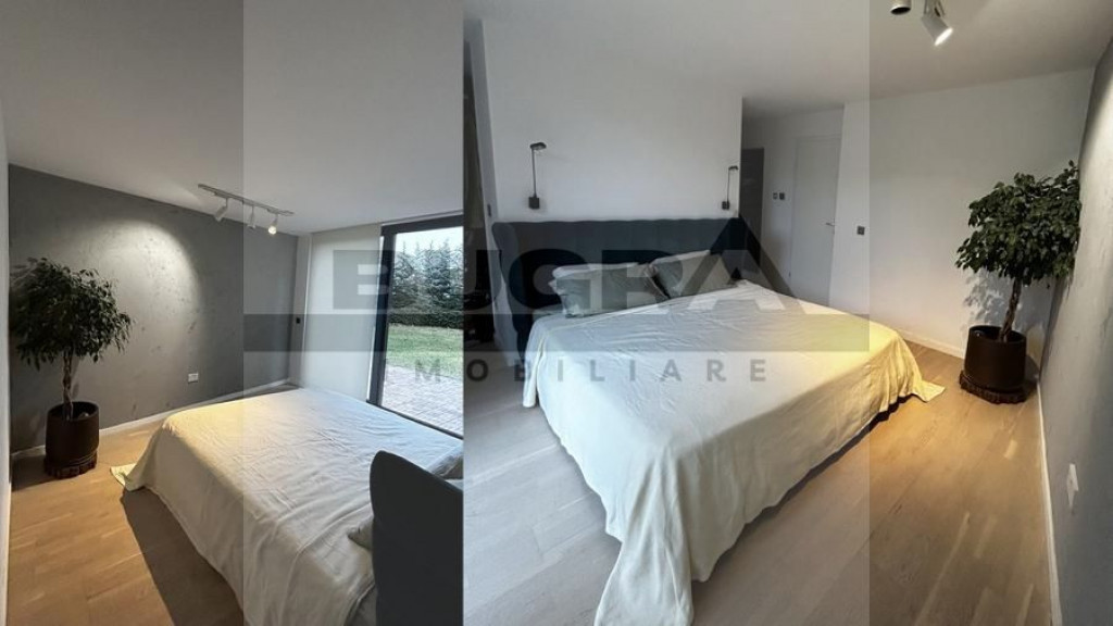 Exteriorul completează perfect experiența locuirii: o curte privată, impecabil amenajată, dotată cu sisteme de irigat și iluminare ambientală. Dormitoarele sunt orientate spre curte, având acces direct prin pereți de sticlă glisabili. Dormitorul matrimonial beneficiază de dressing și baie proprie, oferind un plus de intimitate și confort.