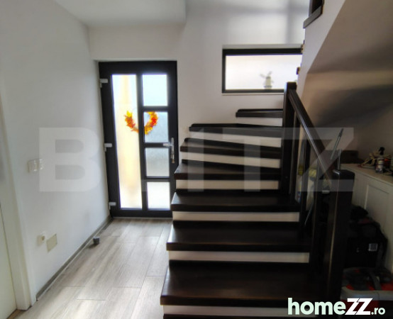 Compartimentare funcțională și compactă: terasă acoperită la intrare, hol de acces, living cu zonă de dinning și ieșire pe terasă acoperită în partea din spate, bucătărie tip open space, baie de serviciu cu duș, debara spațioasă; Etaj: ușă ce delimitează etajul, hol de acces, 3 dormitoare, cameră de baie, dressing, 2 balcoane. Casa este ultrafinisată, mobilată și utilată, acces internet prin fibră optică de la Digi, la etaj sunt 2 aparate de aer condiționat.