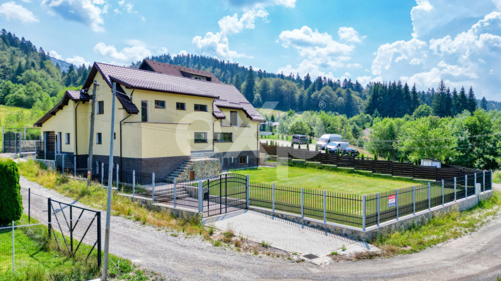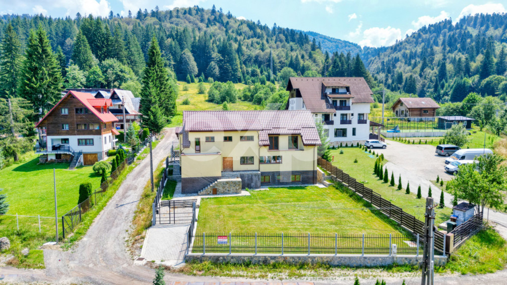 Casă nouă în Predeal – Strada Mănăstirii | Proprietate D+P+M, teren 1.000 mp, proiect cu potențial turistic și rezidențial Pe strada Mănăstirii din Predeal, într-o zonă liniștită, cu deschidere către natură și priveliști montane, se află o proprietate care îmbină spațiul, soliditatea construcției și libertatea de personalizare. Este genul de loc unde liniștea muntelui se simte imediat, iar curtea generoasă îți oferă acel sentiment de aer, intimitate și echilibru pe care tot mai puține proprietăți îl mai pot oferi. Casa este amplasată pe un teren de 1.000 mp, complet împrejmuit cu gard din beton și fier forjat, iar curtea beneficiază de sistem de irigare automatizat, gândit pentru întreținere ușoară și eficientă a spațiului verde. Construcția este dispusă pe Demisol + Parter + Mansardă (D+P+M) și are o suprafață construită de 505 mp, respectiv o suprafață utilă de aproximativ 400 mp, oferind volume generoase, ideale atât pentru locuire, cât și pentru utilizare turistică sau mixtă. Casa este: finalizată la exterior la stadiul de roșu în interior, cu proiect de instalație electrică deja realizat Acest stadiu reprezintă un avantaj real pentru cumpărătorii care își doresc să își personalizeze casa de la zero, fără compromisuri legate de finisaje sau compartimentări impuse. Detalii tehnice și utilități: racordată la curent electric apă și canalizare racordate instalația de gaz este la colțul proprietății, pregătită pentru racordare casă izolată cu vată bazaltică ferestre cu tâmplărie termopan și 3 foi de sticlă, pentru eficiență energetică și confort înscrisă în Cartea Funciară, ceea ce permite achiziția inclusiv prin credit ipotecar Din punct de vedere al utilizării, proprietatea se pretează excelent pentru: casă de vacanță premium la munte investiție turistică (pensiune, închiriere pe termen scurt) locuință rezidențială pentru cei care își doresc spațiu, liniște și intimitate Predealul rămâne una dintre cele mai căutate stațiuni montane din România, cu cerere constantă atât din partea turiștilor, cât și a cumpărătorilor care caută un stil de viață diferit, mai aproape de natură. Proprietatea este prezentată prin materiale video, tur virtual, imagini aeriene și planuri, astfel încât să poată fi analizată în detaliu încă dinaintea unei vizionări fizice. Id intern: EXP545