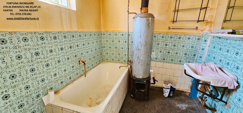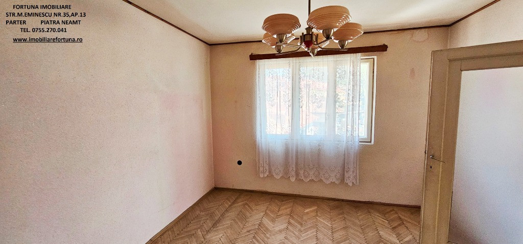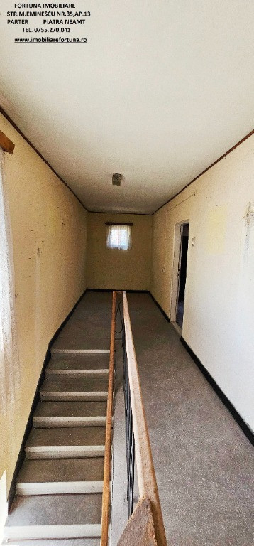 CASA P+1E+POD TIP DUPLEX, SITUATĂ ÎN ZONA CENTRALĂ – MICROMEDICA, MUN. PIATRA NEAMȚ, 115.000 EURO FORTUNA IMOBILIARE oferă spre cumpărare această proprietate compusă din suprafața de 174 mp teren, pe care este edificată o casă tip duplex cu regim de înălțime P+1E+POD, cu suprafața utilă de 120 mp, construită în 1974, pe fundații din beton armat, zidărie din cărămidă, acoperită cu tablă. Este compusă din hol, 3 camere, baie, bucătărie, terasă și balcon. Planșeul dintre etaje este din beton armat, iar podul casei este înalt, are o suprafață generoasă și poate fi utilizat ca spațiu de depozitare. Casa deține 2 beciuri și beneficiază de toate utilitățile ( apă, curent, gaz, canalizare ). Necesită renovare. Ca principale beneficii, imobilul se află într-o zonă rezidențială și oferă echilibru între job și viața personală/de familie, întrucât permite o ușoară accesibilitate către serviciu, instituții educaționale/medicale, centre comerciale/culturale, spații de recreere și pentru petrecerea timpului liber, alte obiective de interes relevante pentru rezidenți. Preț 115.000 euro Pentru o prezentare detaliată a acestei oferte, furnizarea unor informații suplimentare referitoare la situația juridică / identificarea imobilului și programarea unei vizionări, vă invităm la sediul nostru, Fortuna Imobiliare, situat pe str. M. Eminescu, nr. 35, ap. 13, parter, lângă fostul Tribunal, tel. contact 0755.270.041. Your comfort is our priority ! Oferta noastră completă o găsiți aici: https://imobiliarefortuna.ro/