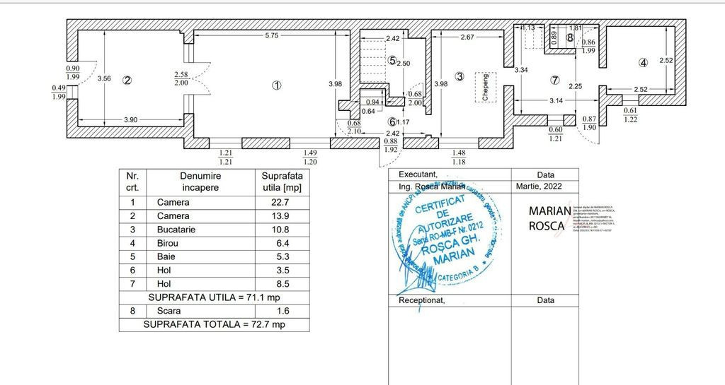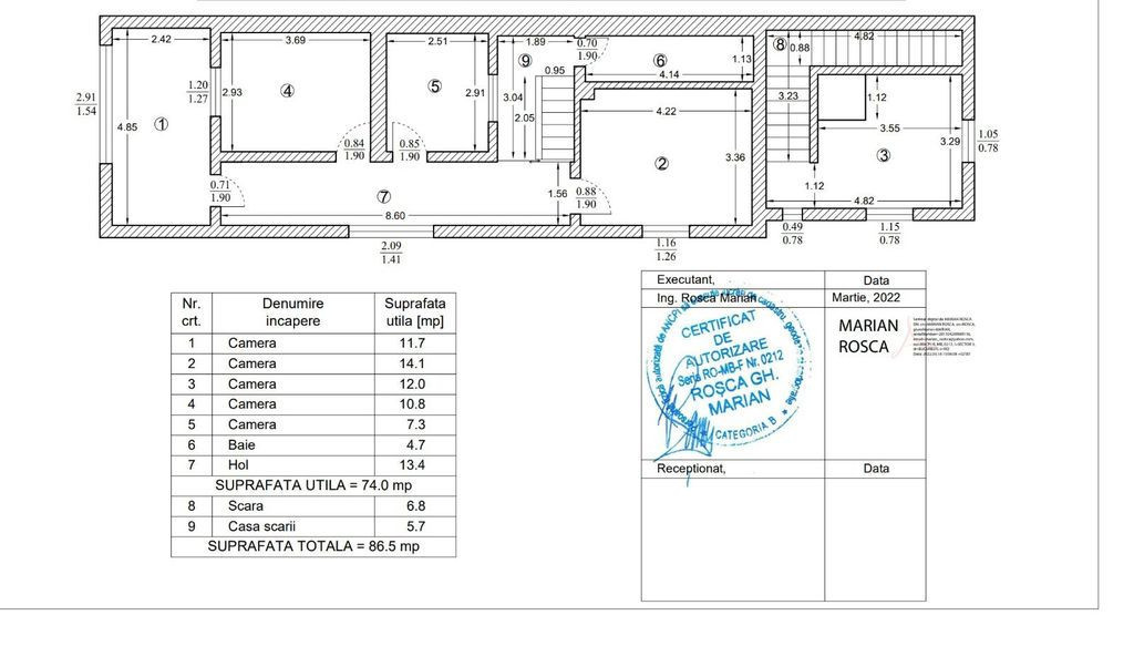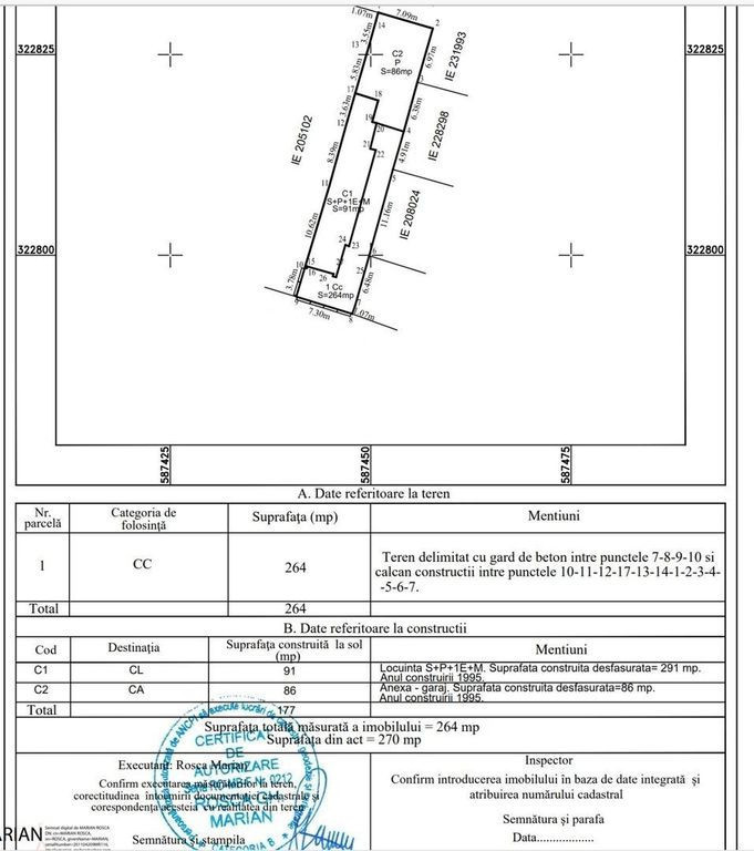 Casa P+1+M Eroii Revolutiei, suprafata construita 250mp, utila 228mp, pivnita 10,6mp, parter 72,7mp, etaj 86,5mp, mansarda 58,5mp, teren 264mp.