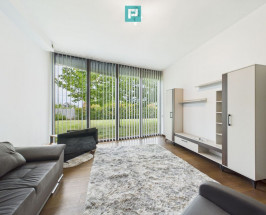 • Grădină principală cu acces direct din terasă, amenajată cu gazon și plante decorative