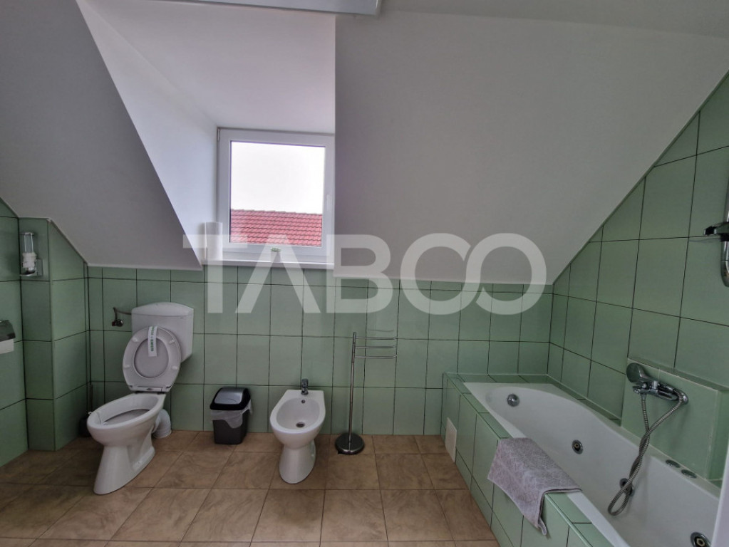 Iti doresti o casa construita dupa anii 2000, cu terasa si multiple locuri de parcare, unde sa iti petreci timpul alaturi de familia ta si totodata poti dezvolta si o afacere in regim hotelier? Iti propunem spre vanzare aceasta casa, mobilata si utilata cu 9 camere, 5 bai si o bucatarie, construita in zona Strand, Sibiu. Casa are o amprenta la sol de 128 mp la care se adauga o terasa de 12 mp. Suprafata construita este de 384 mp, iar suprafata utila 320 mp, fiind construita in anul 2001, pe structura de caramida si renovata complet, este compartimentata decomandat, cu scara interioara pe 4 niveluri, avand zona de living, bucatarie, dorimtoare cu bai proprii si dormitoare, bai cu acces de pe hol, balcoane a caror acces se face ori din camere, ori de pe hol. Casa este izolata termic, incalzirea realizandu-se cu centrala termica individuala cu calorifere si panouri radiante, ceea ce ofera un confort suplimentar. Acoperisul casei este din tigla, iar geamurile sunt din termopan cu 3 foi de sticla pe rame de PVC, permitand un acces ridicat al luminii naturale in interiorul cladirii pe tot parcursul zilei, iar camerele de la etaj si mansarda functioneaza momentan in regim hotelier. Proprietatea care detine 4 locuri de parcare si acces la strada prin poarta cu sistem automat de inchidere - deschidere, se preda finisata, complet mobilata si utilata avand urmatoarele beneficii: -izolatie termica exterioara; -pardosea: gresie si parchet; -bucatarie mobilata si utilata cu: masina de spalat vase, frigider, plita electrica, hota, cuptor electric si rulouri automate la ferestrele si usa dinspre terasa; -acoperis din tigla; -pereti amenajati cu faianta si vopsea lavabila; -usi de acces PVC; -usi celulare la interior; -terasa pavata si amenajata. Pret: 499.999€ Cod ofertă / ID: P15026 Sună-ne acum la 0369.822.820 și află detalii despre această proprietate de vanzare din Sibiu, dar și despre alte proprietăți potrivite pentru tine. Informatii speciale: 1. Descarcă aplicația pe mobilul tau "TABOO Imobiliare" din Apple Store, Google Play sau Huawei AppGallery pentru a afla instantaneu noile proprietăți care intră pe piață. 2. Dacă ai o proprietate pe care vrei să o vinzi sau să o închiriezi, suntem aici pentru tine! Contactează-ne pentru o evaluare gratuită fără obligații și vei descoperi avantajele de a lucra cu o echipă dedicată și experimentată. 3. Dacă vrei sa incepi o cariera de agent imobiliar, suna la 0369.822.820 si programeaza o intalnire pentru a afla toate beneficiile si avantajele. Intră pe TABOO.ro și descoperă cele mai recente oferte, actualizate zilnic. Anunt actualizat in 5 decembrie 2025. Id intern: P15026
