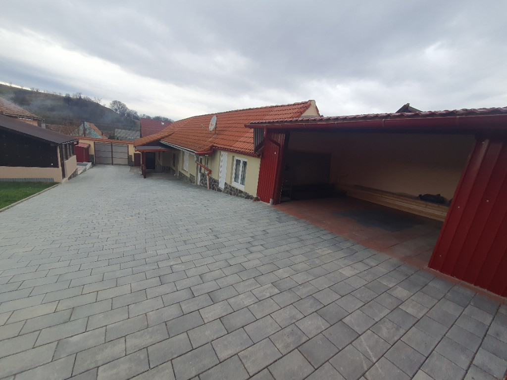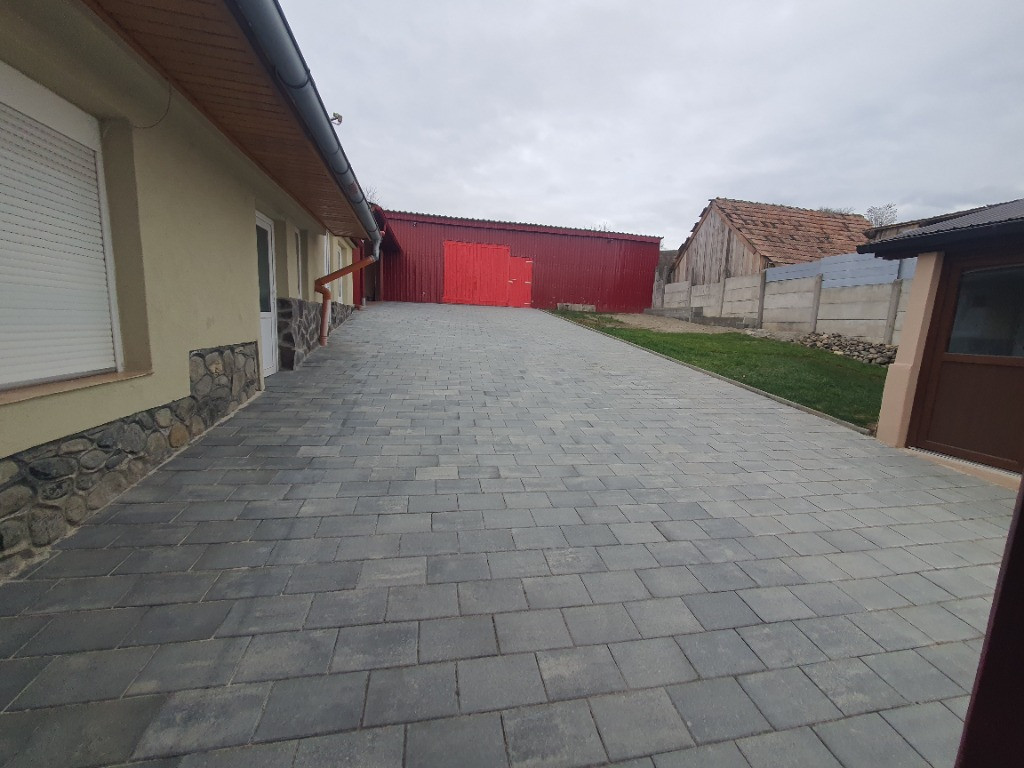 Curte Pavată Extinsă: Proprietatea beneficiază de o curte generoasă, pavată integral pe o suprafață de 1.000 mp, oferind spațiu amplu pentru parcare și agrement.