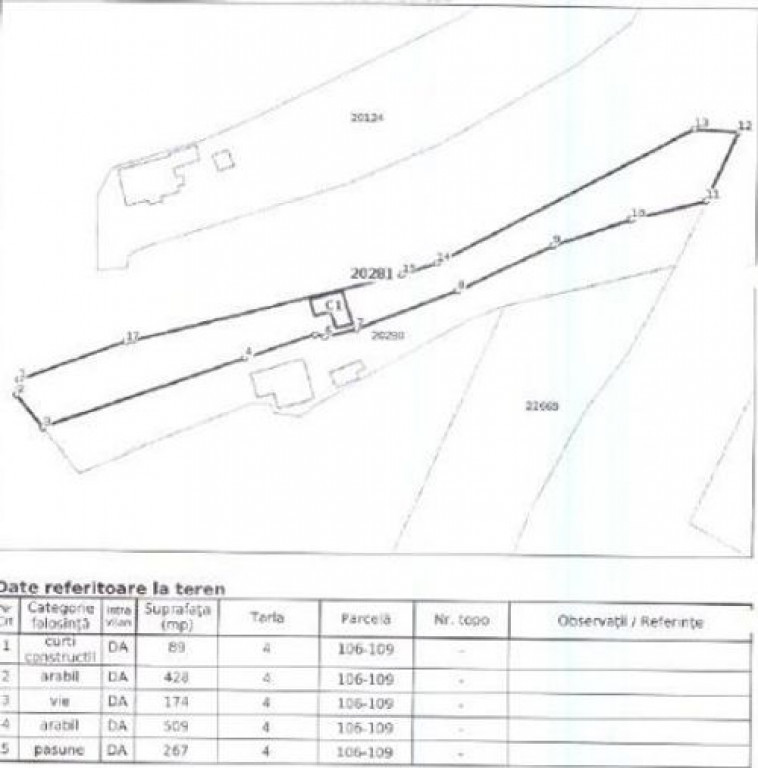 Imobilul se vinde in licitatie publica! Proprietate rezidentiala compusa din teren intravilan, avand categoria de folosinta ""curți construcții", "arabil", "vie", pășune, in suprafata totala de 1,467 mp și constructie C1 - locuinta, situata in sat Coconari, accesul realizandu-se din Str. Retezat sau str. Fagaras, drum asfaltat, cu o banda pe fiecare sens de mers. Terenul este plat si are o forma relativ dreptunghiulara. Acesta are o deschidere la drum de aproximativ 11.81 ml si este imprejmuit din gard de lemn. Terenul este impartit astfel: 89 mp categoria curți construcții, 937 mp categoria arabil, 174 mp,categoria vie, 267 mp categotia pășune. Constructia a fost edificata in anul 1960 si are regim de inaltime P. Casa are o suprafata construita de 37 mp si o suprafata utila esimata de 32 mp. Constructie este din caramida, iar acoperisul este de tip sarpanta din lemn cu invelitoare din tabla. Dispune de tamplarie exterioara din tocuri de lemn si geamuri simple. Se considera ca dispune de finisaje inferiaore la interior. Aspectul imobilului la exterior se prezinta intr-o stare precara. Imobilul dispune de utilitati publice disponibile in zona. Casa este amplasata in zona estica, mediana a localitatii Coconari, intr-o zona rezidentiala, caracterizata prin prezenta unor proprietati de tip casa/vila vechi si noi. Imobilul este situat in Coconari, Str. Retezat, com. Posta Calnau, jud. Buzau.